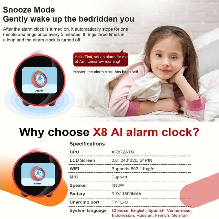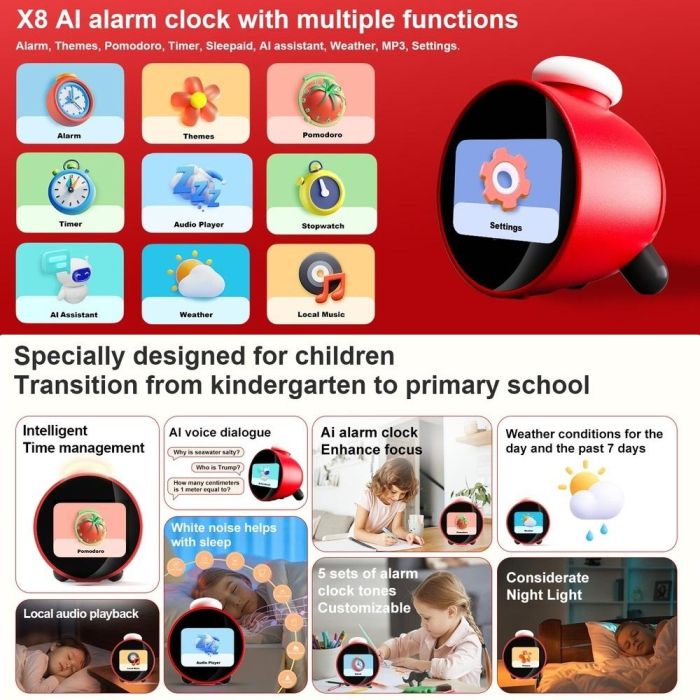 It's more than just an alarm clock. Use the AI voice assistant to chat, answer questions, check the weather, manage your time with Pomodoro, and play local MP3 music files. Full voice control with natural language interaction