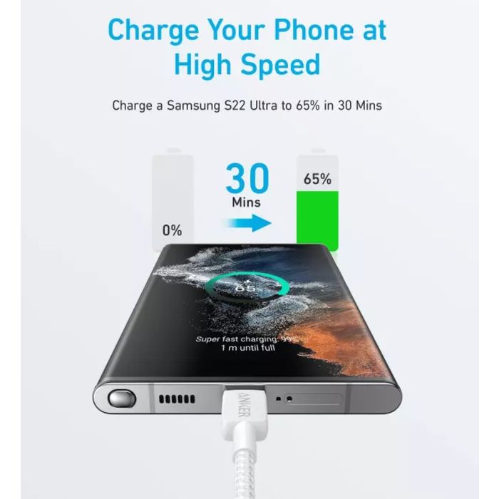 Upgrade your charging experience with the Anker USB-C to USB-C cable. This ultra-durable cable is built to last, with a premium braided nylon exterior and reinforced connectors. Experience lightning-fast charging speeds of up to 100W, thanks to its compatibility with Power Delivery (PD) 3.0.
