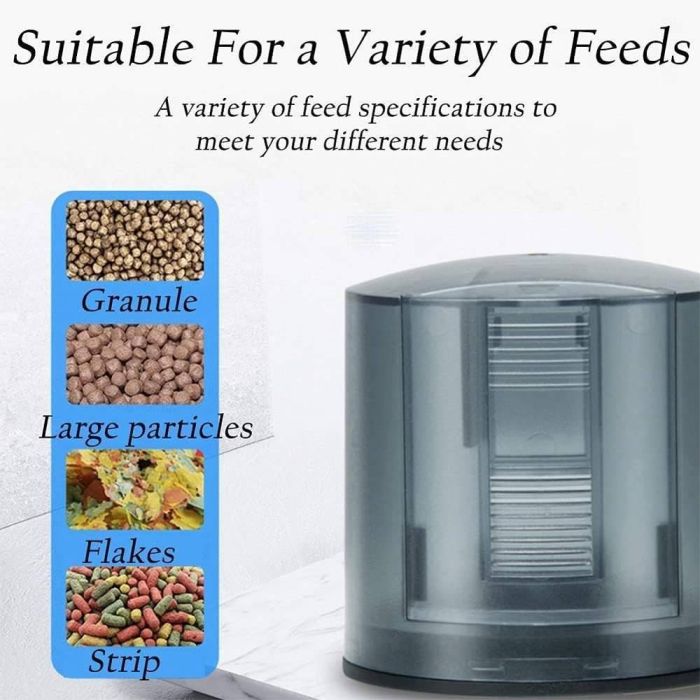 - Accommodates most types of fish food (flakes, granules, or crumbs)