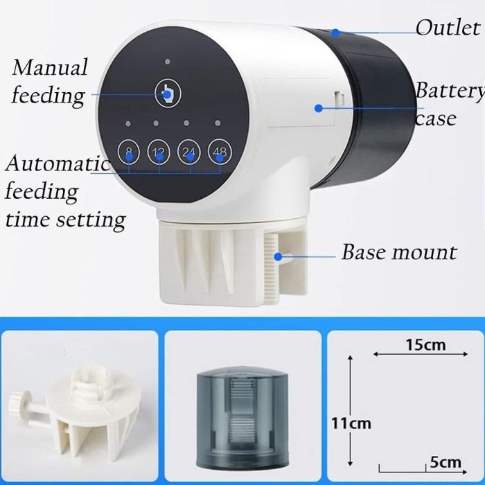 Don't let your busy schedule get in the way of your fish's health! This automatic feeder provides a smart and efficient solution to ensure regular and accurate feeding. You can program it to dispense food up to 4 times a day, and it features ultra-quiet operation. Battery-operated and with a compact design, it's easy to install in any aquarium, making it the perfect addition to your fish's life.
