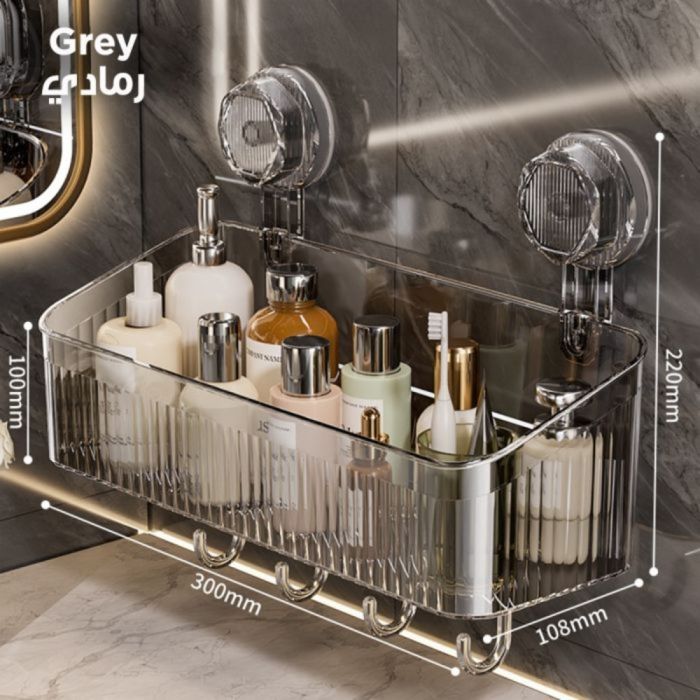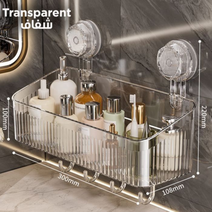 This wall-mounted storage shelf features strong suction cups for quick, drill-free installation. It provides organized space for daily essentials and includes 4 versatile hooks for hanging towels and accessories. Its sleek, multi-purpose design seamlessly fits any decor, ensuring perfect organization and smart space-saving with a modern touch