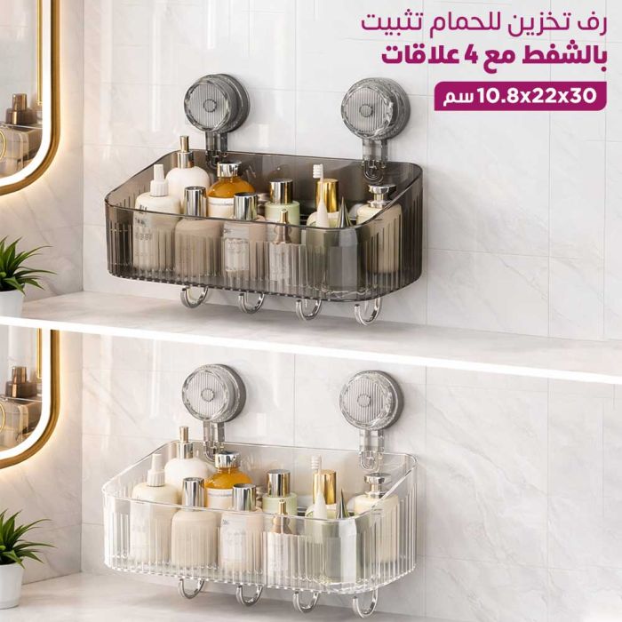 - Suction Cup Bathroom Storage Shelf with 4 Hooks