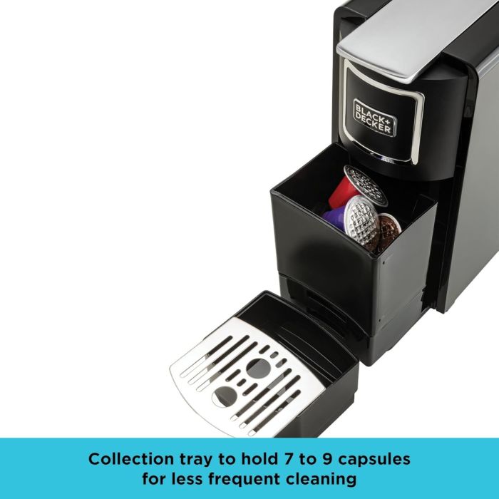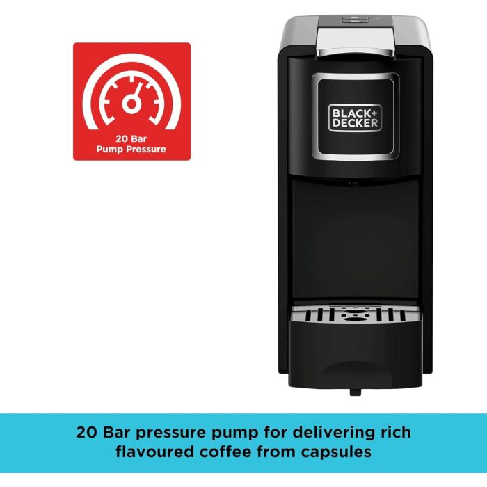 Experience the joy of barista-quality coffee at home with the Black+Decker Capsule Coffee Machine. This sleek and compact machine delivers delicious espresso, double espresso, and Lungo with just a touch. Enjoy rapid brewing, adjustable strength options, and effortless cleaning thanks to dishwasher-safe parts. Elevate your daily routine with the convenience and deliciousness of this exceptional coffee maker.