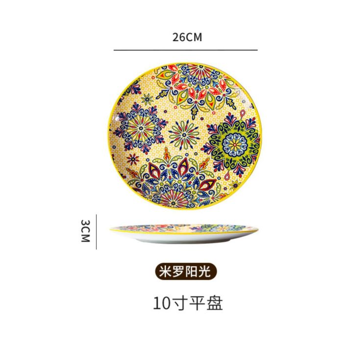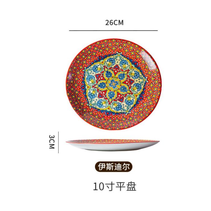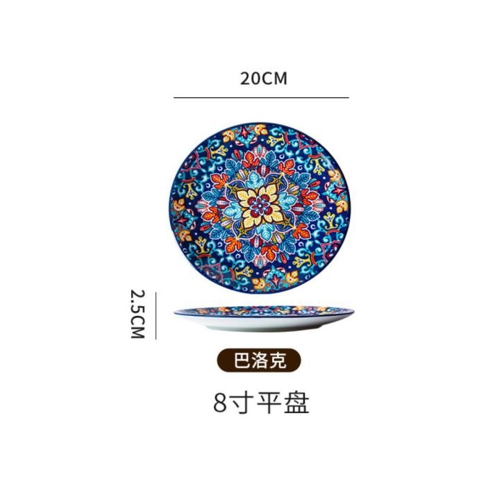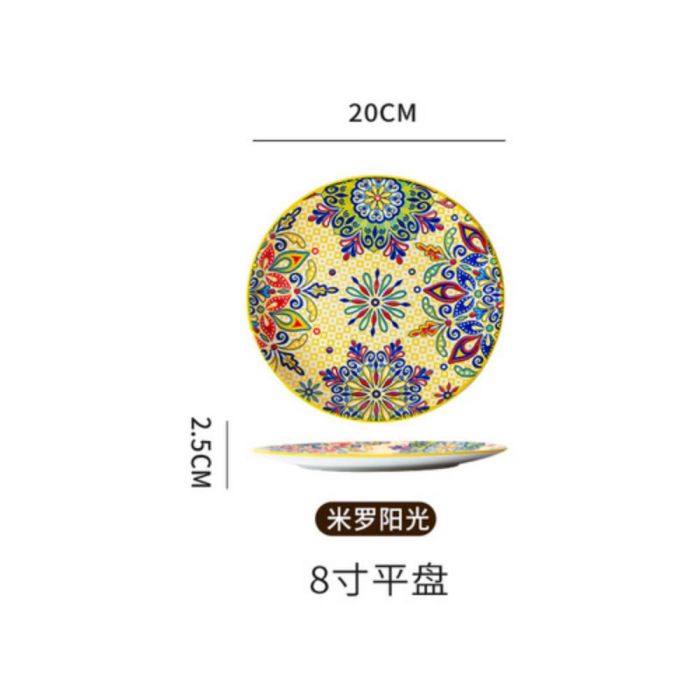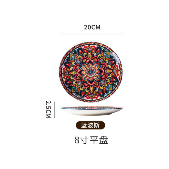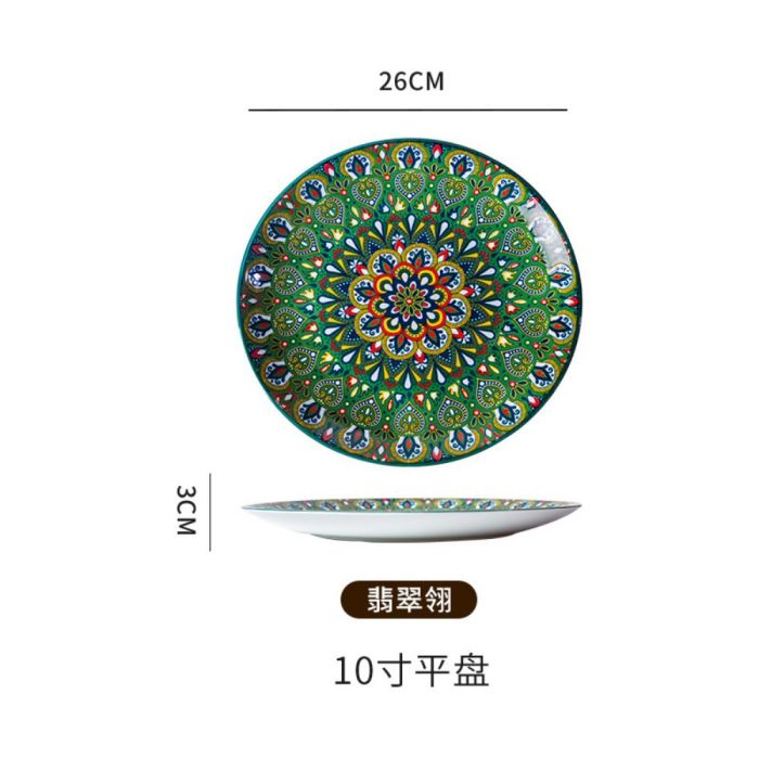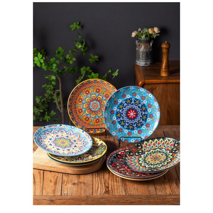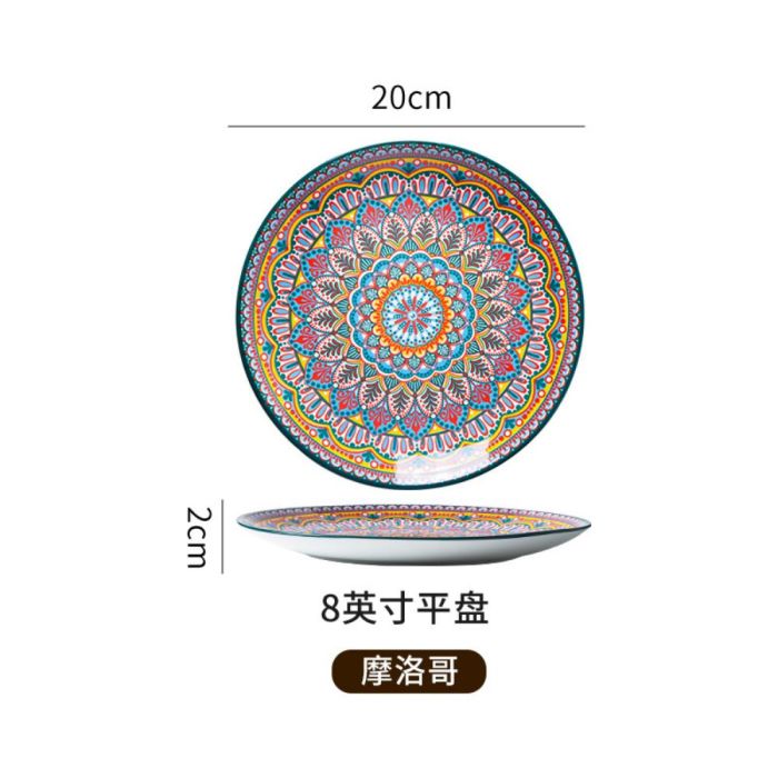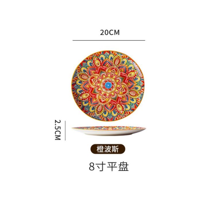 This Bohemian porcelain flat plate made of premium porcelain, featuring vibrant artistic patterns, suitable for daily serving and elegant hosting, adding a refined touch to the table with comfortable and balanced use