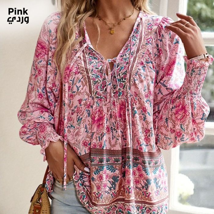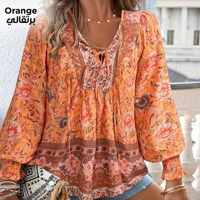 Add your own artistic touch with this blouse, featuring details inspired by bohemian chic. It features a V-neck with an embellished tie and long, wide sleeves for a soft, sensual look. It comes in warm colors and feminine floral prints, adding a lively touch to your wardrobe. Enjoy the opportunity and create a creative look by pairing it with jeans, summer shorts, or skirts for a chic and comfortable bohemian look.Today’s Deal is Bohemian Style Long Sleeve Tie Blouse For Women