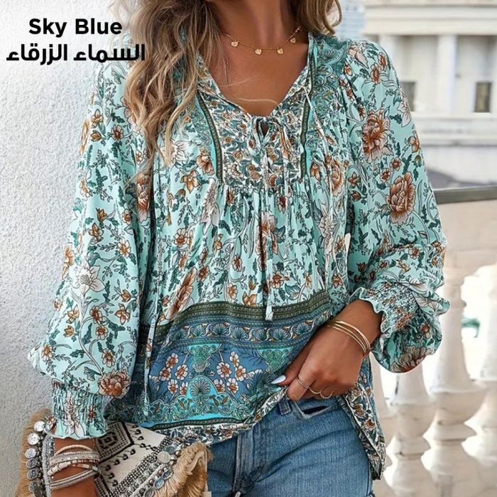 - Bohemian Style Long Sleeve Tie Blouse For Women