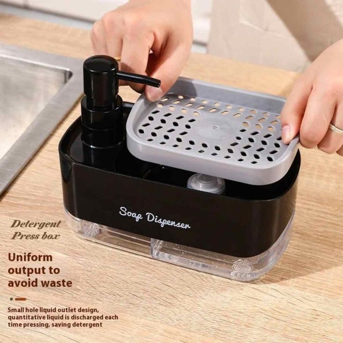 - This dispenser has a multifunctional design, and not only stores hand soap and dishwashing means, but also includes a built-in sponge holder. It eliminates the need to search for cleaning supplies, making your kitchen more organized and efficient