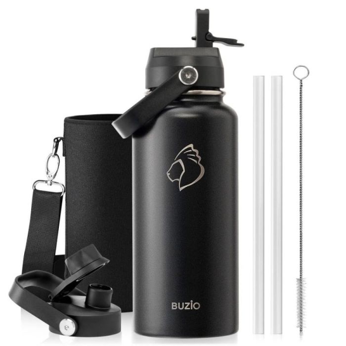 - Buzio Duet Series 1.2L Water Bottle with 2 Lids and Sleeve - Black