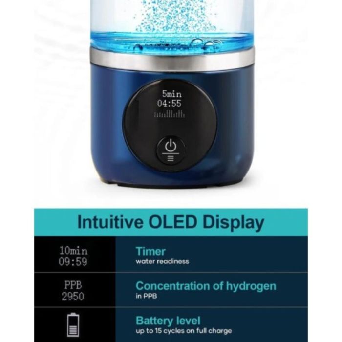 The Buzio hydrogen water bottle offers an advanced hydration experience, generating hydrogen-rich water known for its antioxidant properties that help reduce free radicals, support recovery, and improve sleep quality. It features a modern, user-friendly design with an OLED display showing hydrogen level, battery status, and remaining time, making it ideal for athletes, health enthusiasts, and those with an active lifestyle.