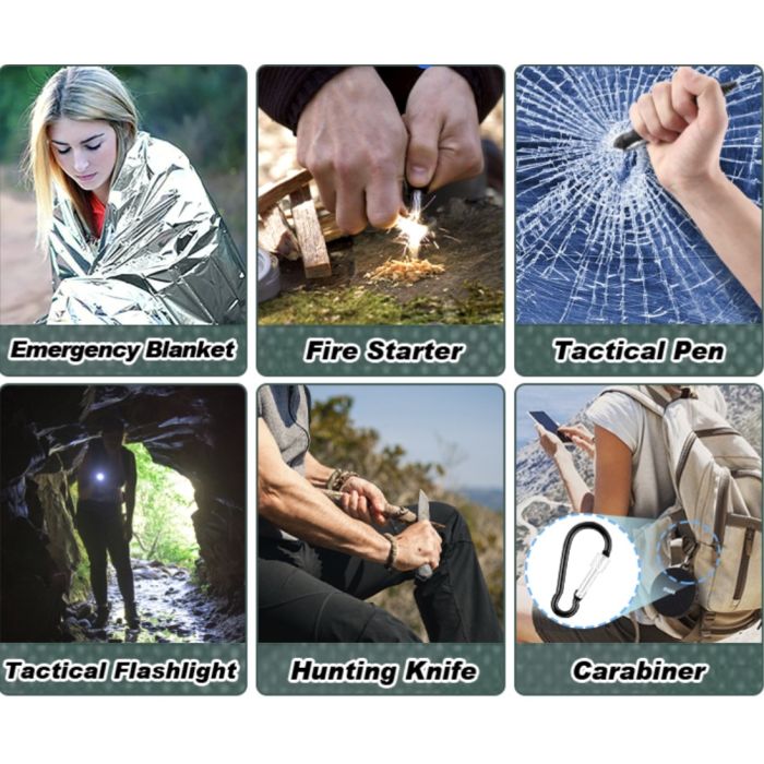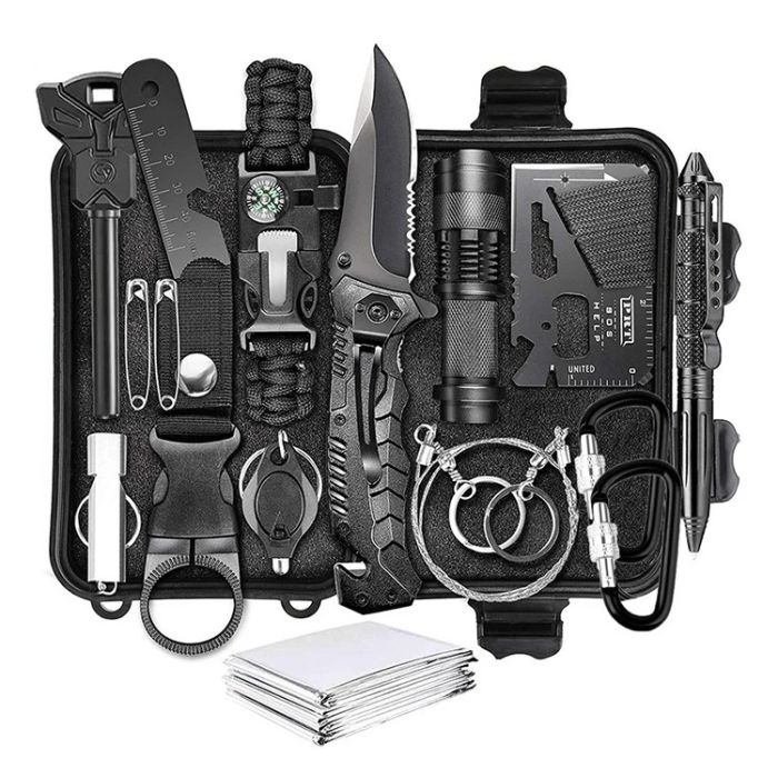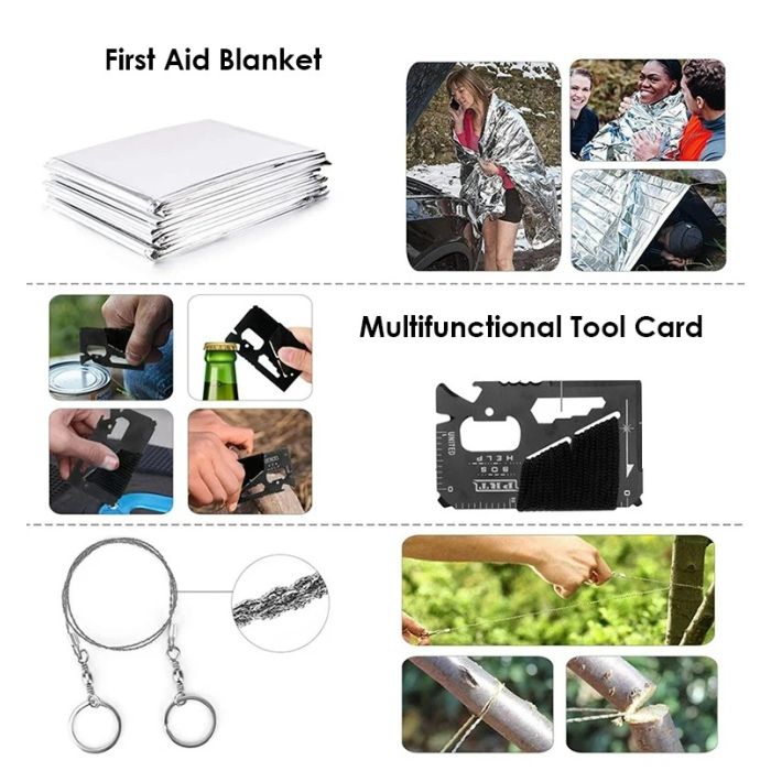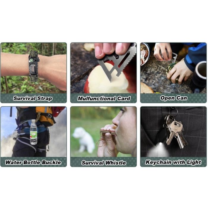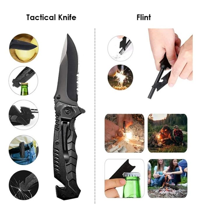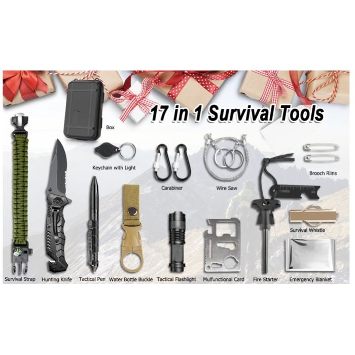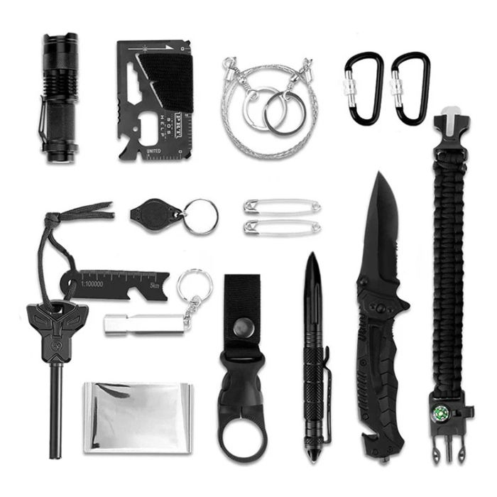Be prepared for any adventure with this Camping Survival Tool Kit, your essential companion for conquering the wilderness. Packed with 17 versatile tools and provides everything you need to navigate any situation, from igniting a fire to signaling for help. Its compact and lightweight design makes it easy to carry on your next outdoor adventure, ensuring you're always ready for the unexpected