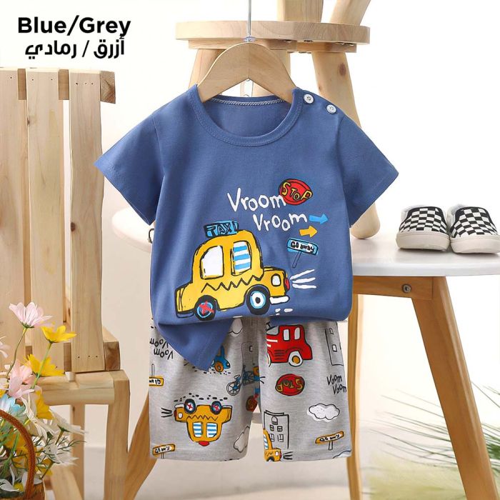 - Car Pure Cotton Summer T-shirt and Shorts Set - 2-3 Years - Blue / Grey