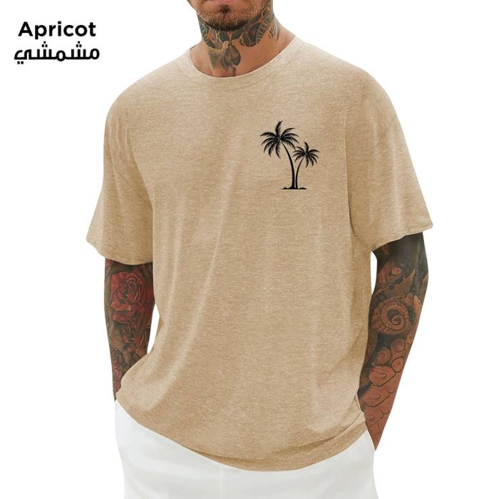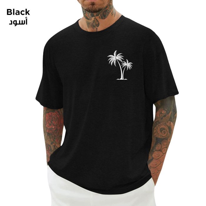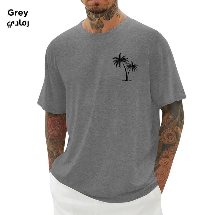 This stylish men's coconut tree print T-shirt is crafted from high-quality fabric, offering perfect comfort throughout the day. Its modern and sporty design makes it the ideal choice for casual occasions and outdoor activities. Featuring an attractive gray color, it adds a touch of elegance and distinction to your look. With drop shoulder sleeves, it provides a contemporary touch and ease of movement, making it an essential piece in your wardrobe.