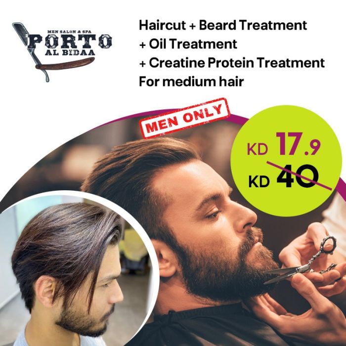 Haircut + Beard Treatment + Oil Treatment + Creatine Protein Treatment For Medium Hair from Porto Albidaa Spa And Salon