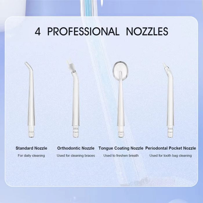 Discover the optimal way to maintain your dental health with high-tech convenience and unmatched comfort using this remarkable device, whether you have braces, dental implants, or even sensitive gums, this device is specifically designed to meet all your needs. Equipped with 1200mAh lithium battery, 200ml water tank with 4 nozzles for tooth cleaning