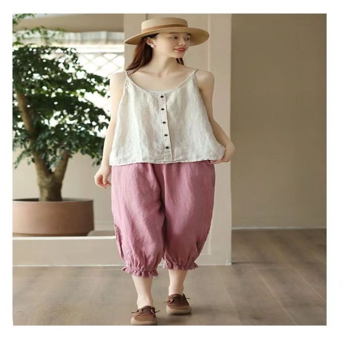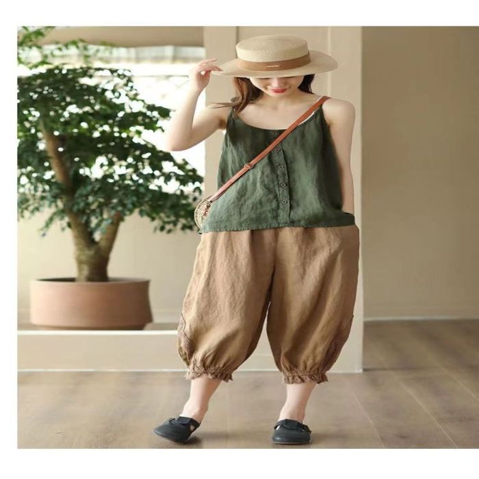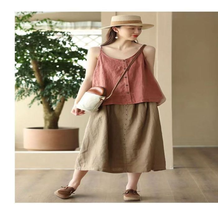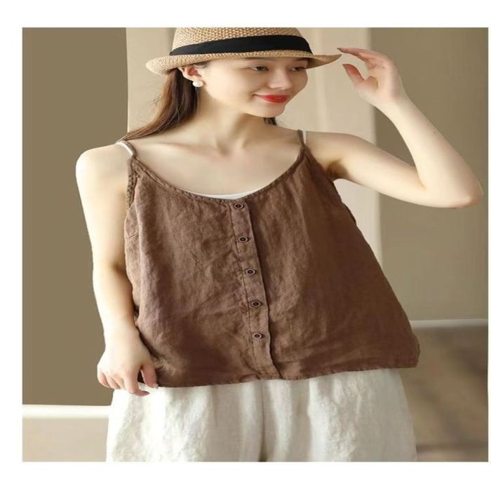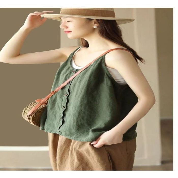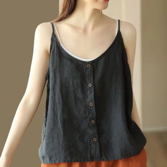 This Lightweight Cotton and Linen Tank Top for Women is Made from a Soft and Breathable Blend, Featuring a Slim Strap Design and Stylish Decorative Buttons. Perfect for a Comfortable Base Layer or Standalone Top, It Offers Superior Comfort and a Gentle Feel Against the Skin, for a Cute, Retro, Summery Look.
