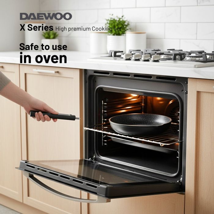 Enjoy an exceptional cooking experience with the Daewoo X Series 9-piece cookware set. Designed to combine elegance, durability, and versatility, this set is crafted from high-quality cast aluminum with a premium double non-stick granite coating, ensuring smooth cooking and effortless cleaning. Whether you're preparing everyday meals or exploring new cooking techniques, the Daewoo X Series delivers superior performance on all types of hobs, including induction.