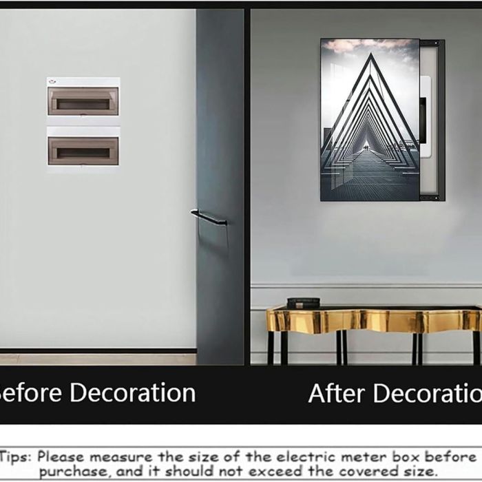 Decorative cover for the electrical panel combines artistic beauty with the security function of concealing meters and exposed wires. The aluminum frame protects switches from dust while providing easy access when needed, transforming the electrical box into a sophisticated work of art that blends seamlessly with your home décor.