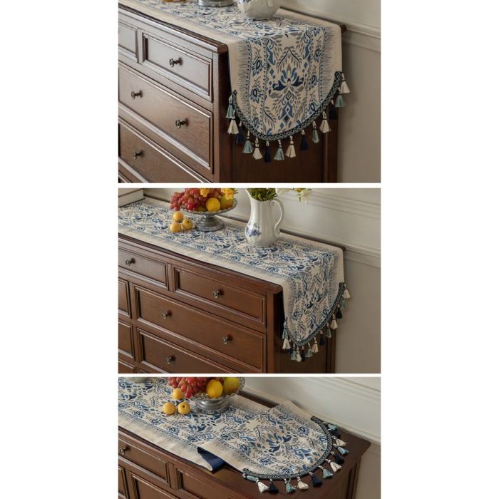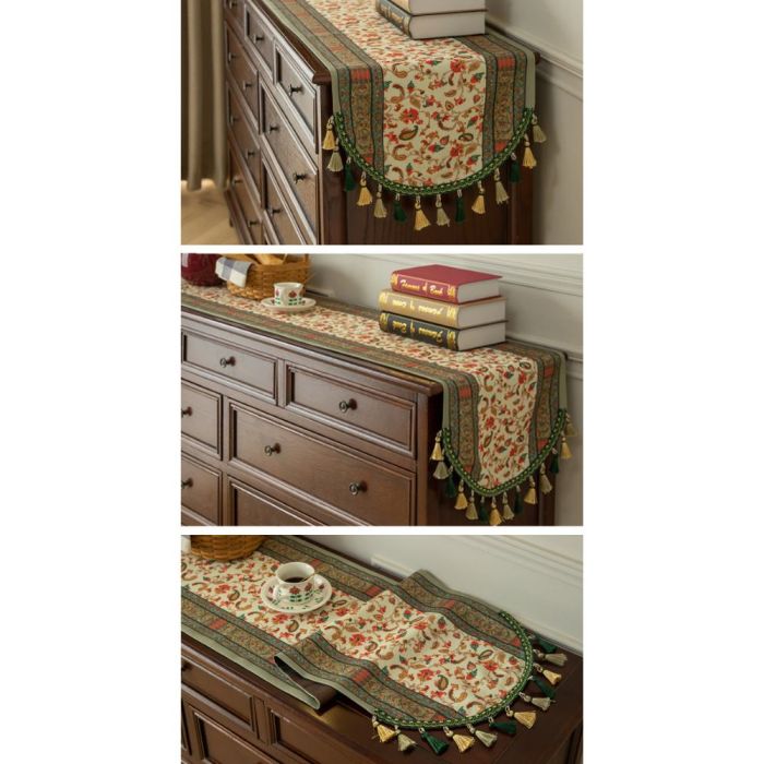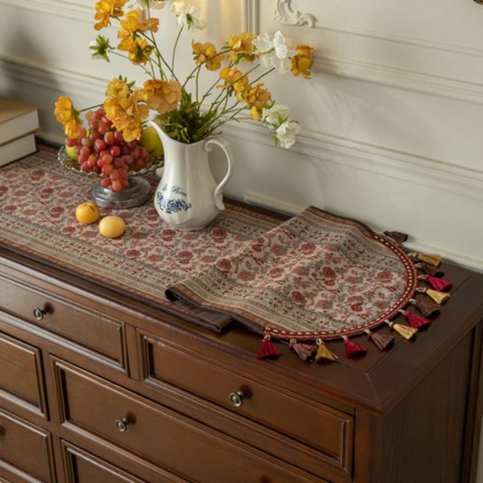 This Decorative long table runner made from soft polyester fibers, featuring elegant classic patterns and attractive tassels, adds a luxurious and warm touch to the table, ideal for daily styling and refined décor
