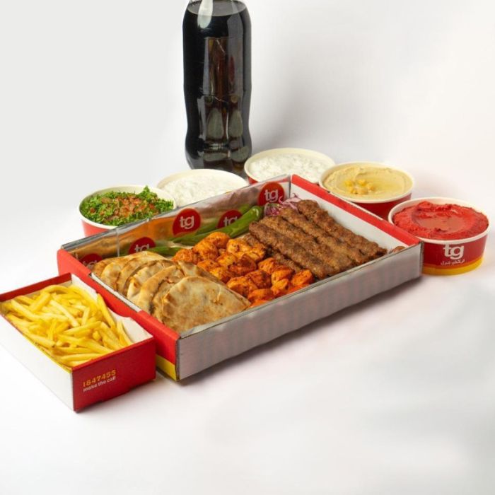 meal include: 8 skewer Meat kebab, 4 skewer tawook, 2 arayes bread, hummus, Red Motabal with youghrt, tabbouleh, French fries and coca-cola.