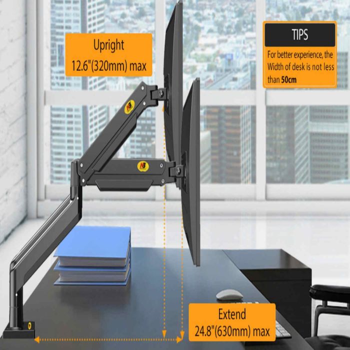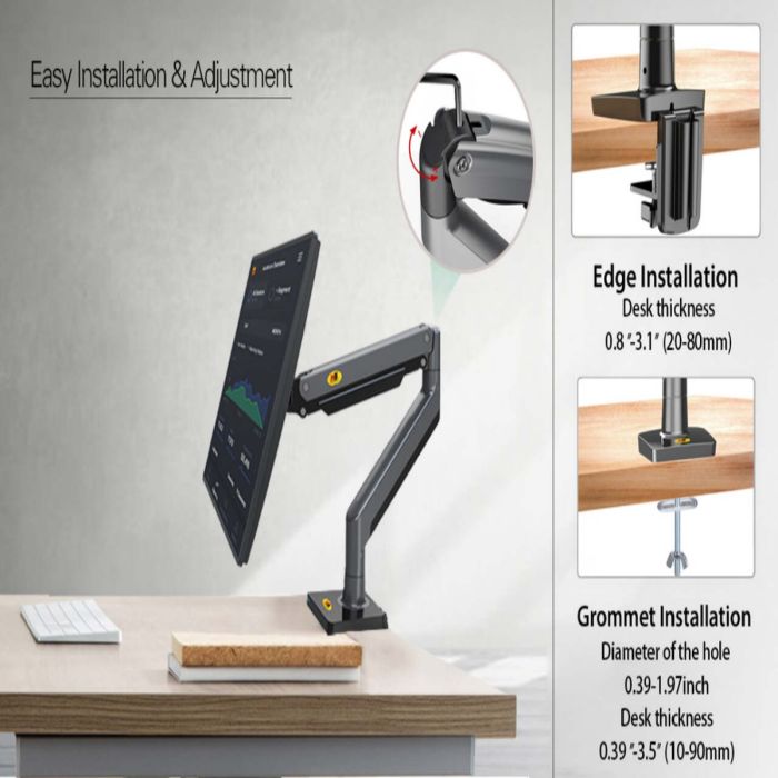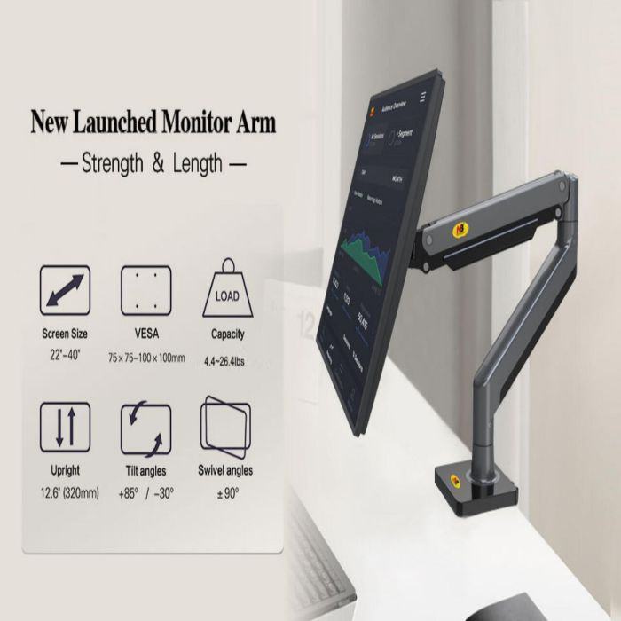 - Fully adjustable gas-spring arm for smooth height, tilt, swivel, and rotation control.