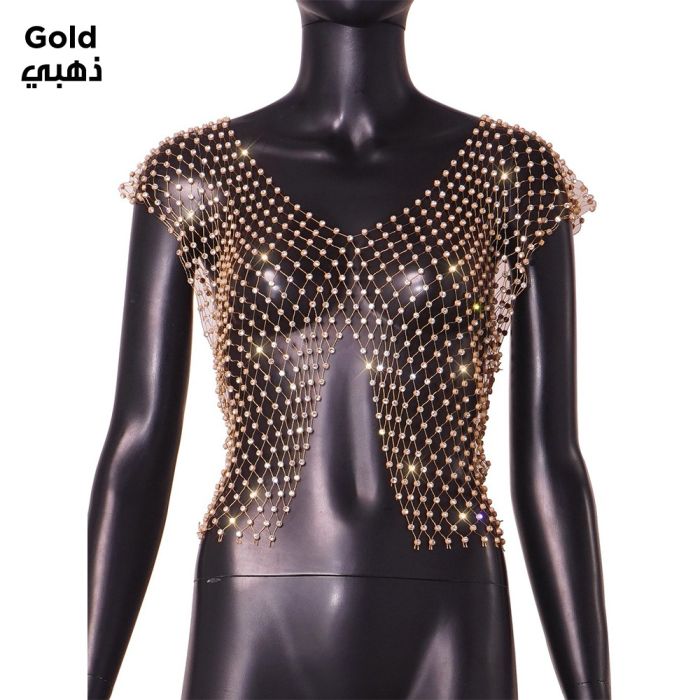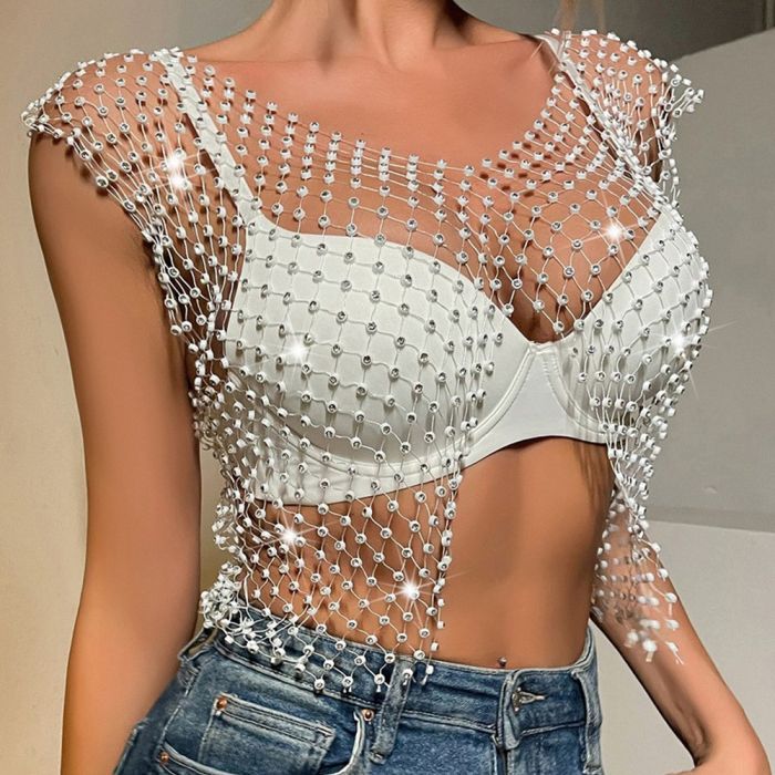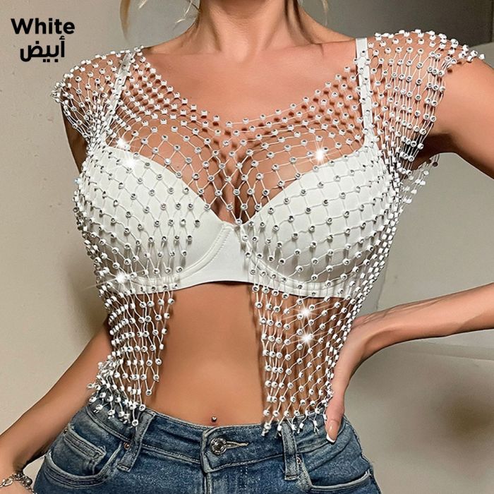 Shine a striking look with this mesh blouse, designed to give you a bold, contemporary look. The sheer fabric adds a feminine touch, while the diamond embellishments add a luxurious sparkle that glistens with every movement. Ideal for women seeking distinction, it can be styled over a simple top or worn with high-waisted pants or a satin skirt for a sophisticated look. Light and comfortable, it's perfect for warm weather and special occasions.Today’s Deal is Diamond Studded Sleeveless Mesh Blouse For Women