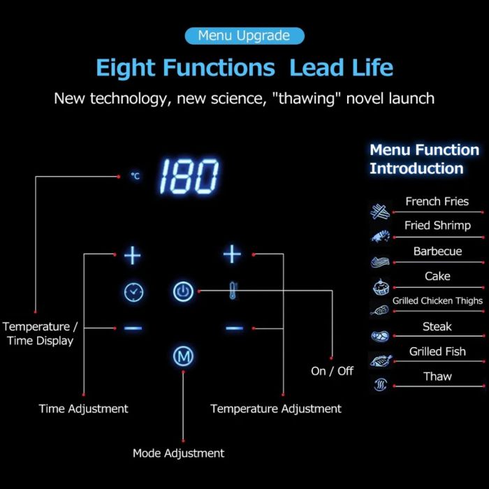 Air fryer with a fantastic ergonomic design that will add taste to your kitchen, you will be able to make the tastiest fries without oil for the whole family in one go! Bake, fry, and grill delicious snacks and meals like chicken, fries, vegetables, pie, bread and much more, with less fat, keeping the same taste and texture!