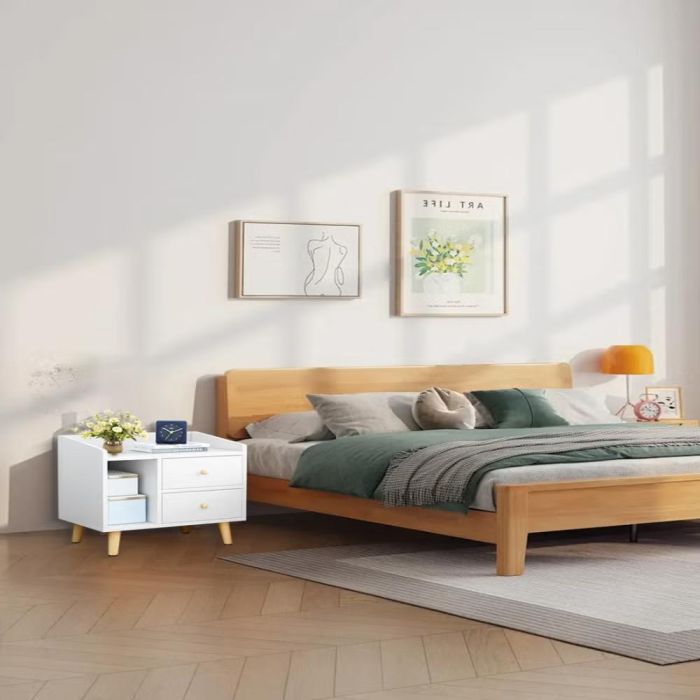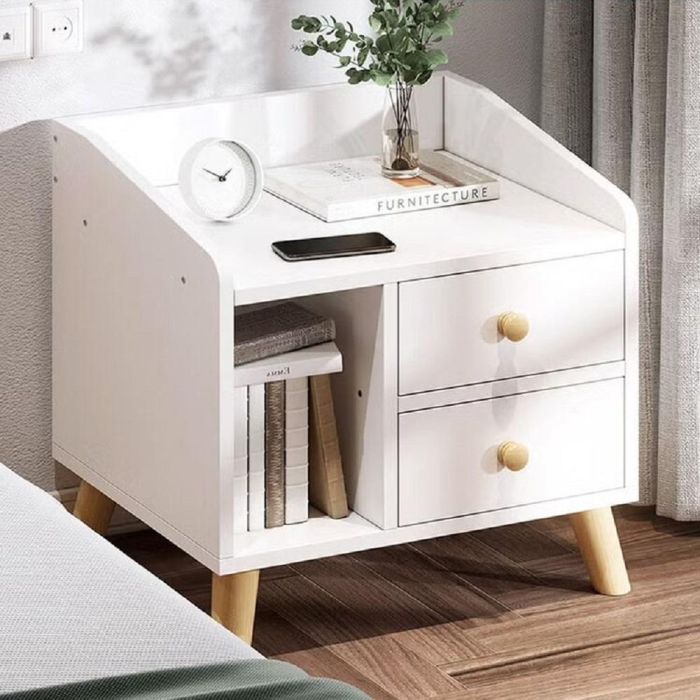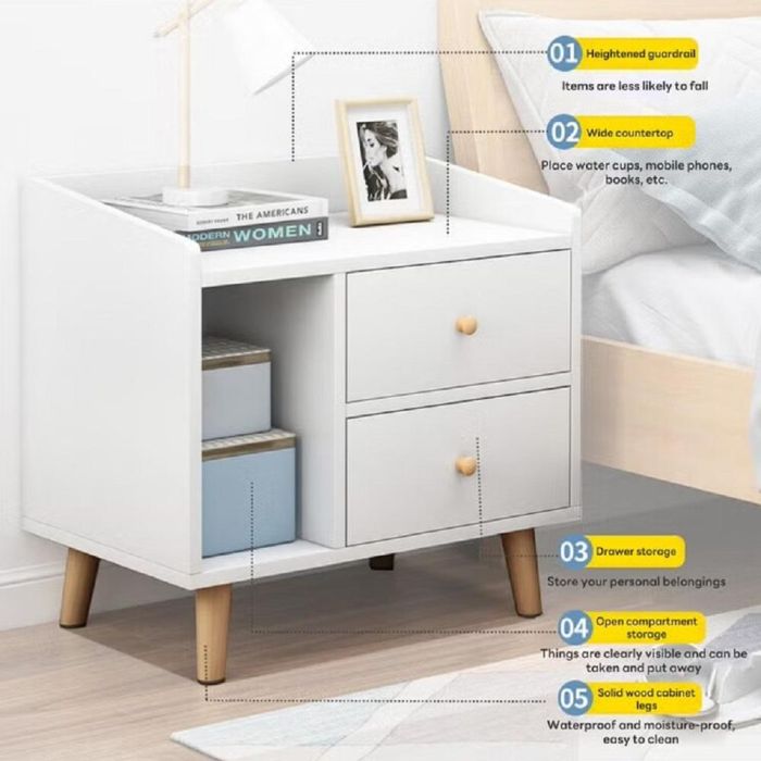 Stylish and practical bedside table. Featuring spacious drawers with an open shelf, it provides ample storage for all your essentials. constructed with thick wood panels and a stable durable legs to fit daily use