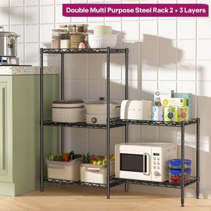 This double multi purpose rack 2 + 3 layers made from a strong steel frame gives you full control over organizing your items, helps you maximize space in a clean elegant way, and makes daily home organization easier and more comfortable