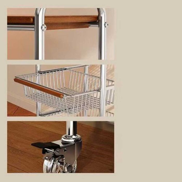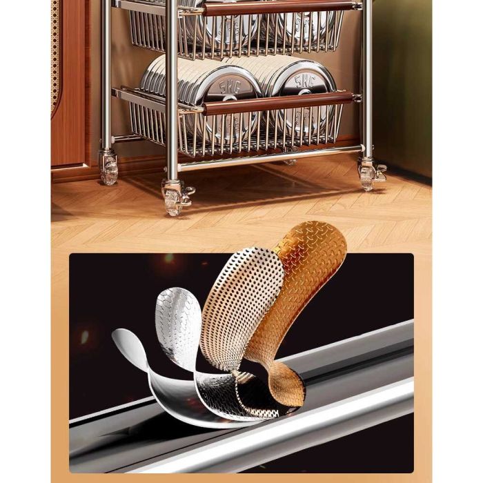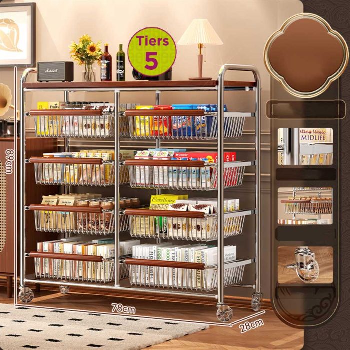 This Steel Organizer is designed for strength and flexibility, featuring removable layers for customized arrangement and smooth sliding metal baskets with anti-fall stops. The solid steel frame ensures stability, while wheels provide easy movement with an option to lock in place