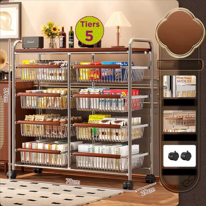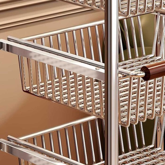 This Steel Organizer is designed for strength and flexibility, featuring removable layers for customized arrangement and smooth sliding metal baskets with anti-fall stops. The solid steel frame ensures stability, while wheels provide easy movement with an option to lock in place