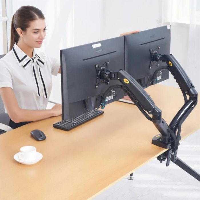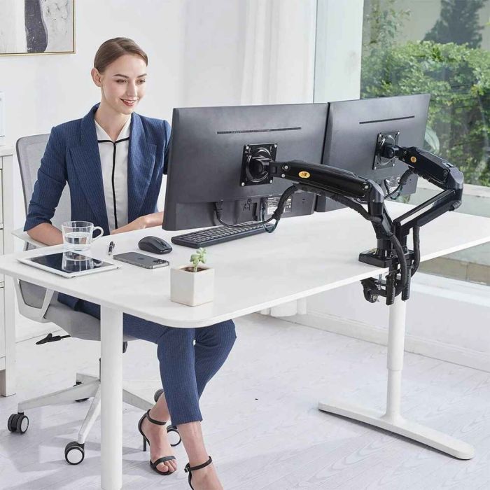 - Dual monitor arm supporting two screens between 17″ and 27″, up to 9 kg each.