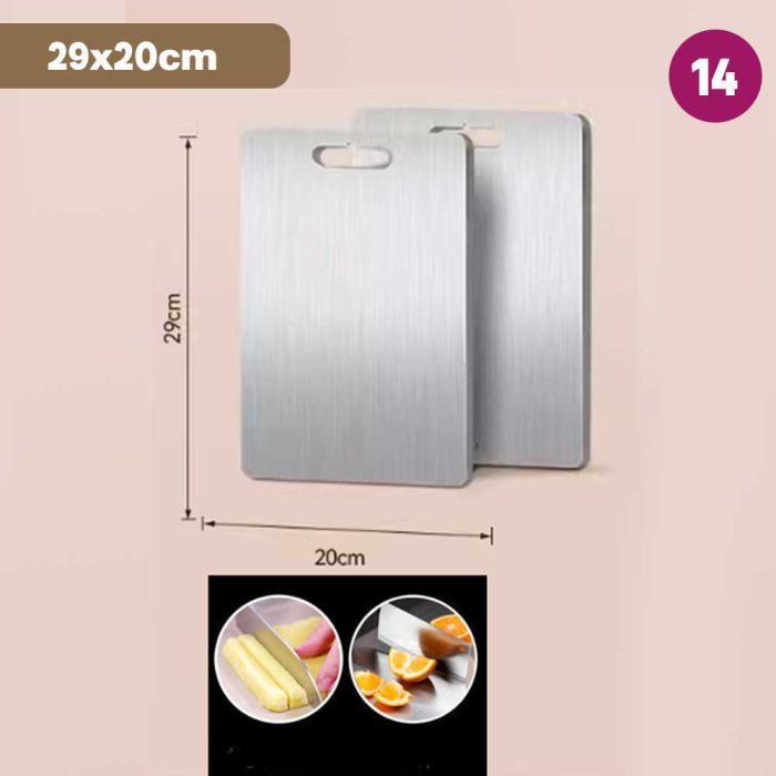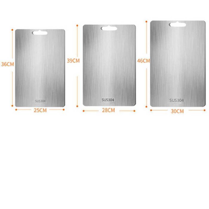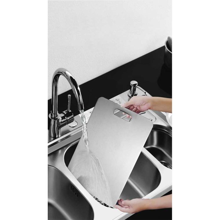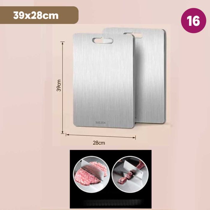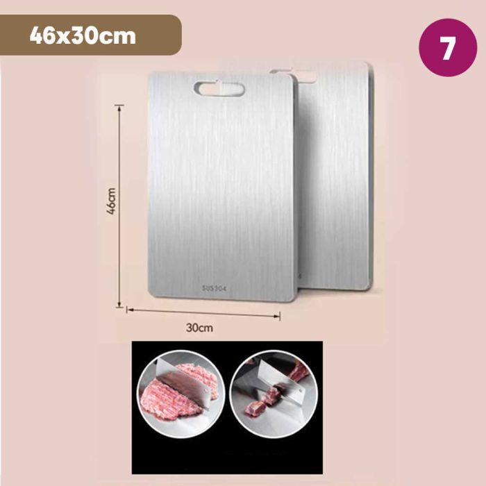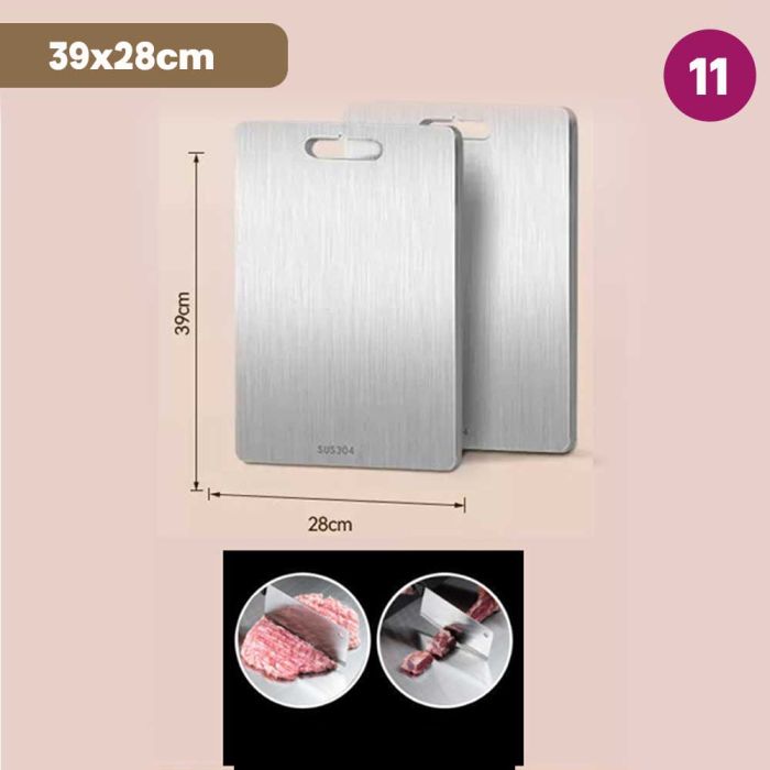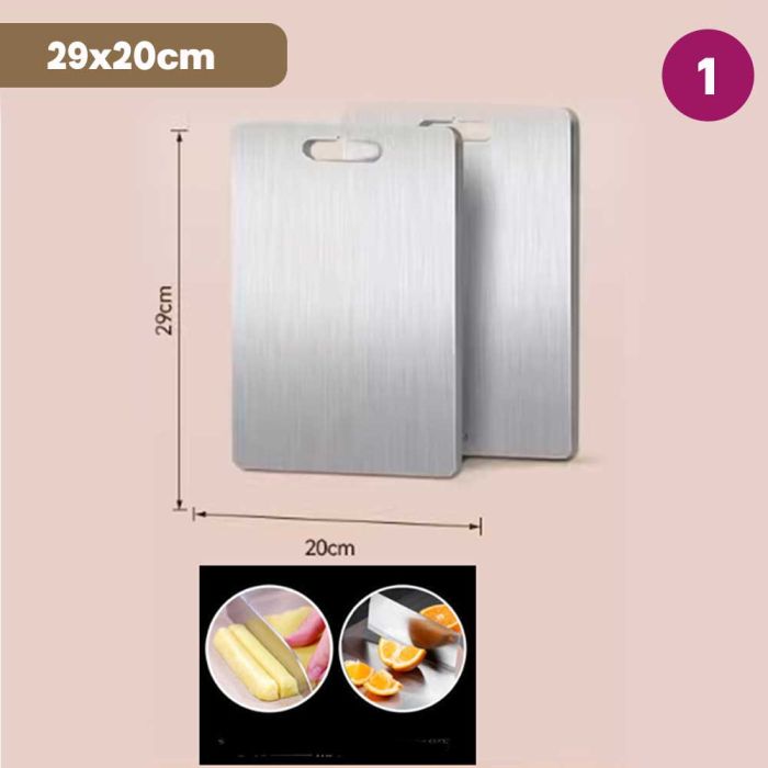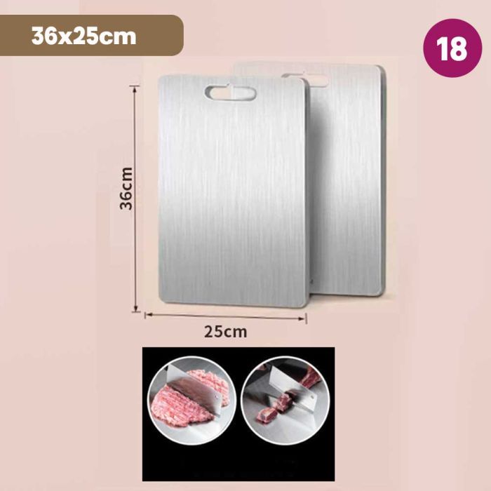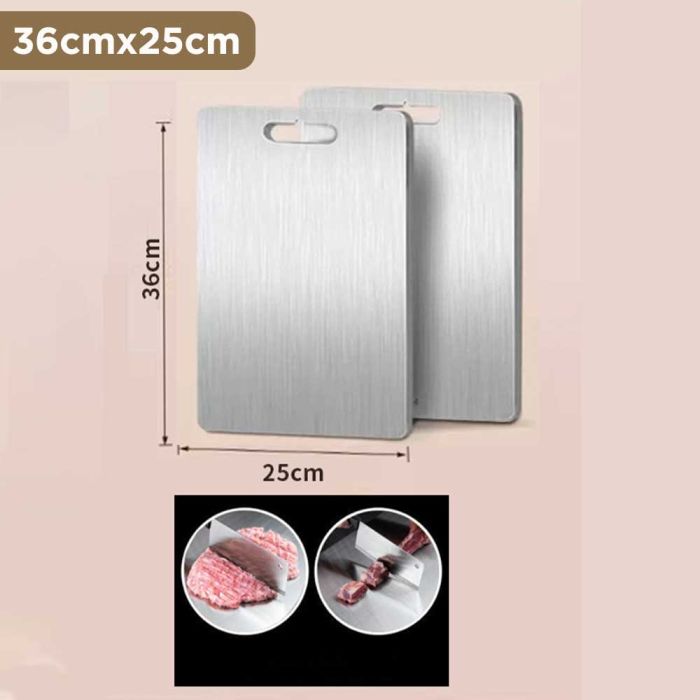 This double-sided stainless steel cutting board is antibacterial and made from high-quality materials to ensure cleanliness and health with every use. It features a dual design that provides two different surfaces to meet all your kitchen cutting needs. It guarantees durability and strength to withstand intensive daily use while maintaining its elegant and practical appearance, making it the perfect choice for every modern kitchen that values fine details.