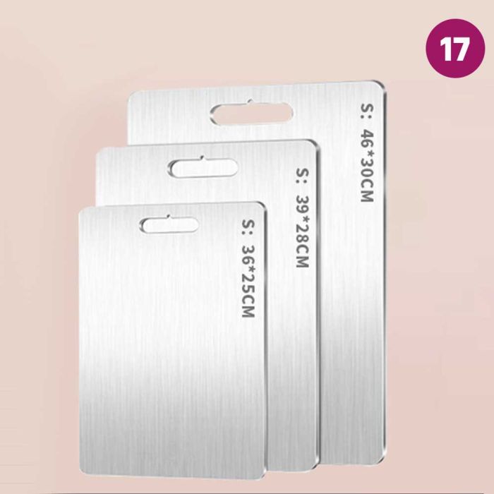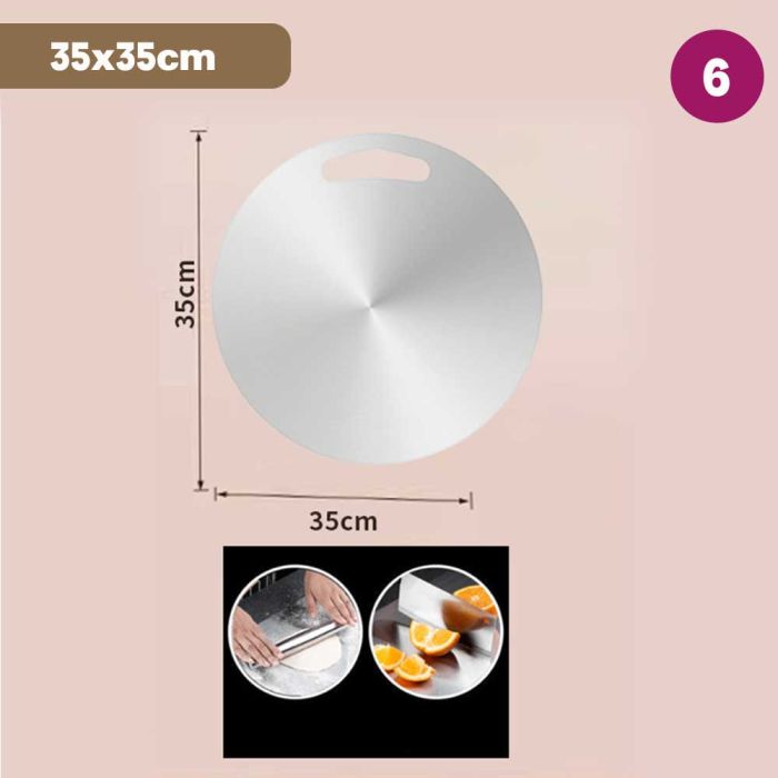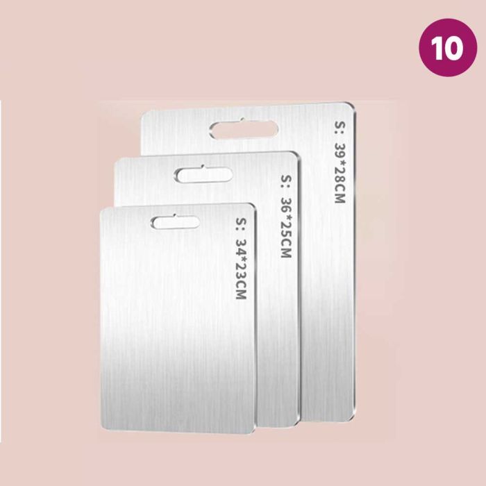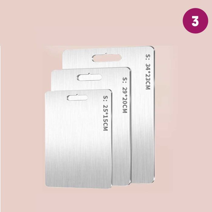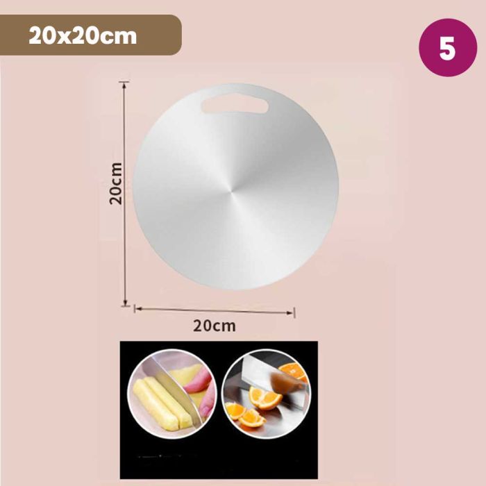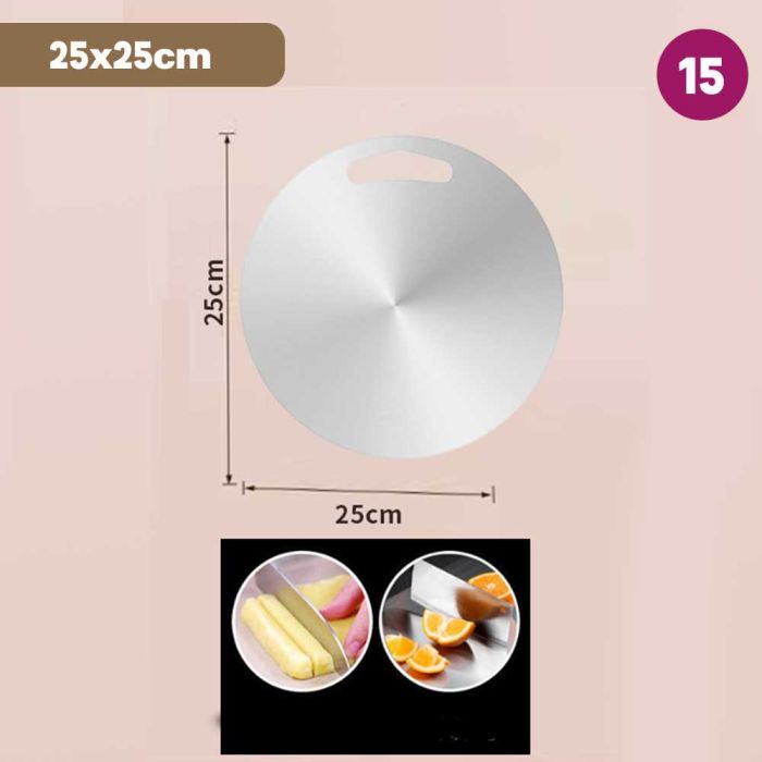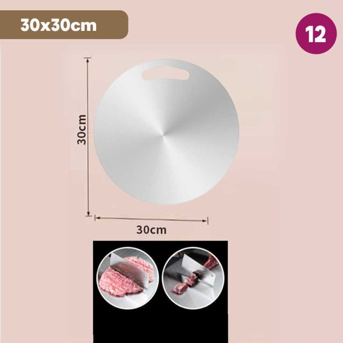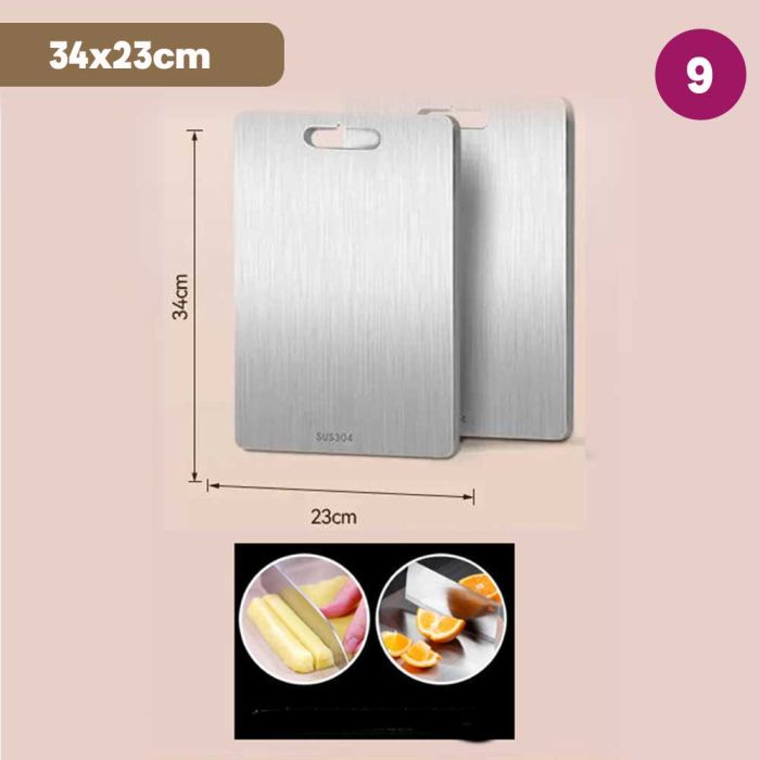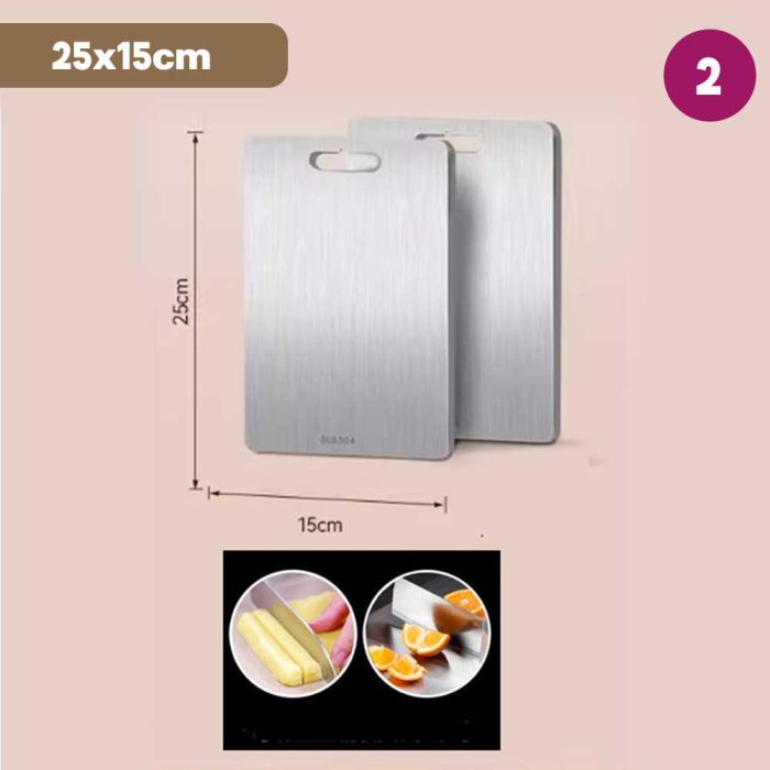 This double-sided stainless steel cutting board is antibacterial and made from high-quality materials to ensure cleanliness and health with every use. It features a dual design that provides two different surfaces to meet all your kitchen cutting needs. It guarantees durability and strength to withstand intensive daily use while maintaining its elegant and practical appearance, making it the perfect choice for every modern kitchen that values fine details.