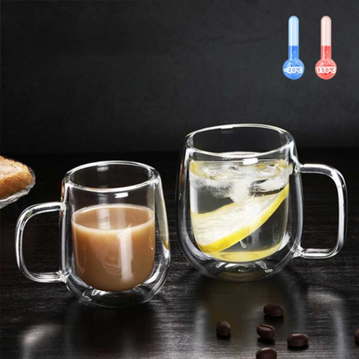 This elegant double-layered glass cup made from high-quality borosilicate glass, offers a comfortable and safe drinking experience thanks to its innovative design that retains the temperature of beverages for longer. Perfect for daily use at the office or home, it adds a touch of elegance and practicality to your daily routine, ensuring you enjoy your favorite drinks with complete style and comfort without worrying about temperature changes.