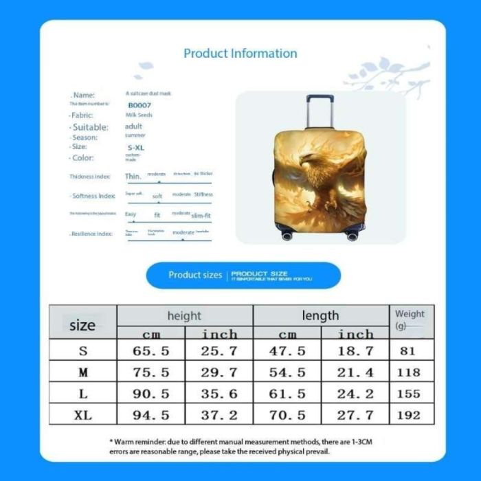 This Elastic Travel Bag Protector Gives Your Bag Extra Protection from Dust and Scratches. Flexible Design and Durable Material Maintains Its Quality for a Long Time. Easy to Install and Remove. Adds a Stylish Touch to Your Bags and Makes Them Stand Out While on the Go.