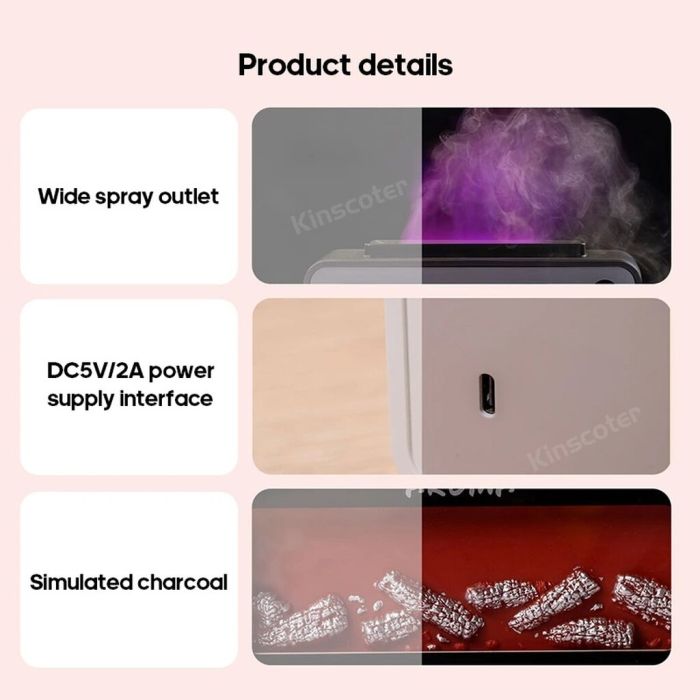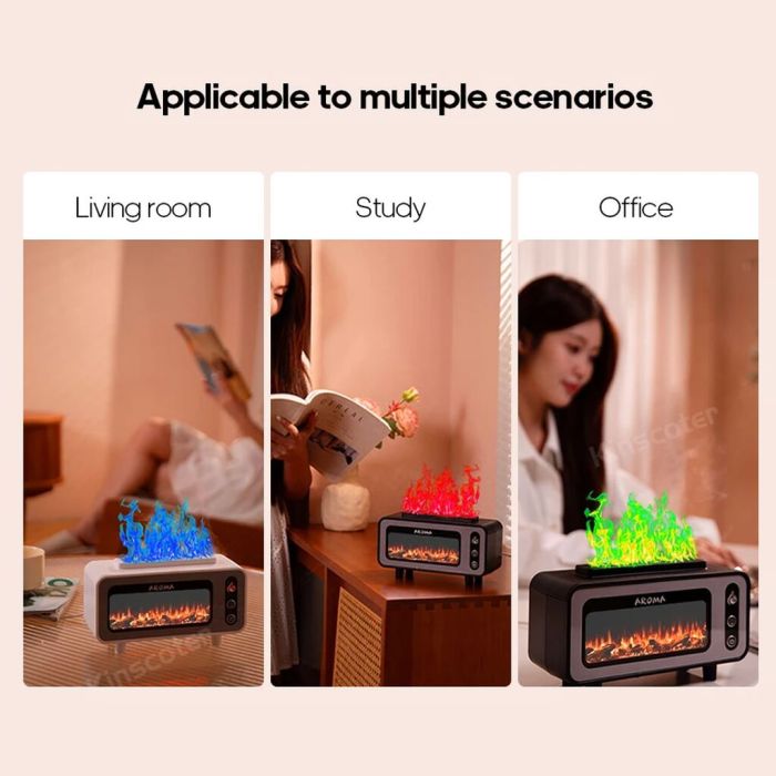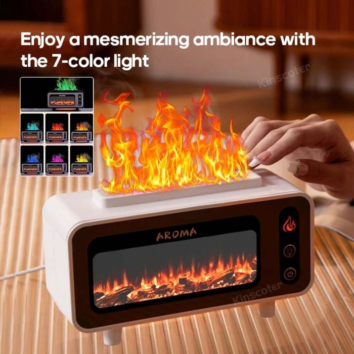 Transform any room into a haven of comfort and relaxation with this unique diffuser that combines air humidification and aromatic mist with a realistic flame effect that mimics the warmth of a fireplace. Its elegant design with colorful lighting adds a magical decorative touch. Making it perfect for bedrooms, offices