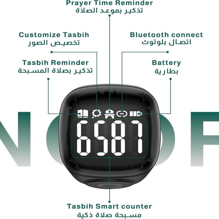 Discover the perfect blend of spirituality and technology with this digital Zikr ring, featuring a precise counter and clear display for easy tracking. It supports the iQibla app, offers 5 daily prayer reminders, and delivers up to 7 days of battery life