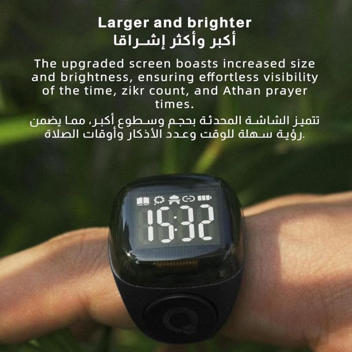 The digital ring allows you to track prayer times accurately by syncing with your mobile phone. It automatically displays prayer times, with Tasbih smart counter up to 99999 counts