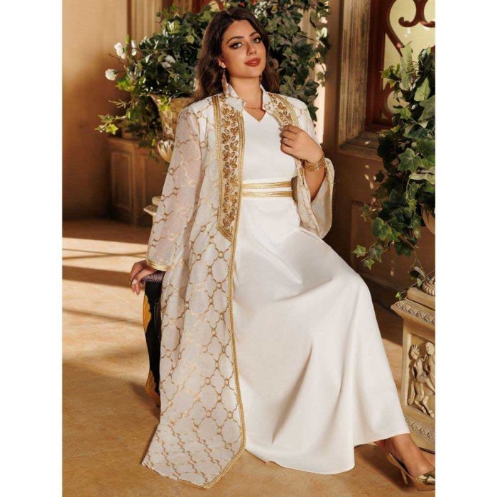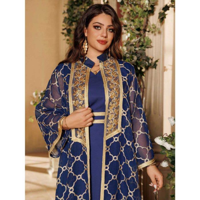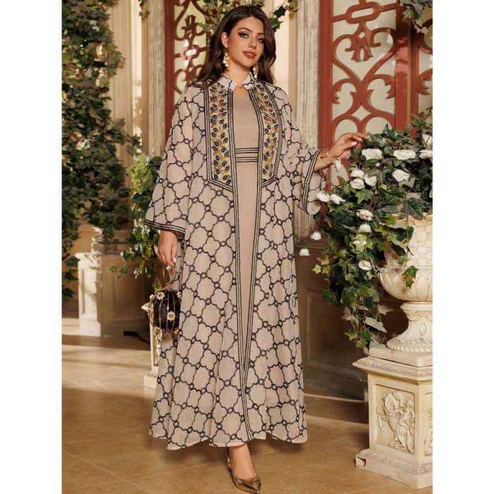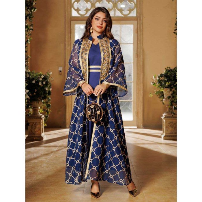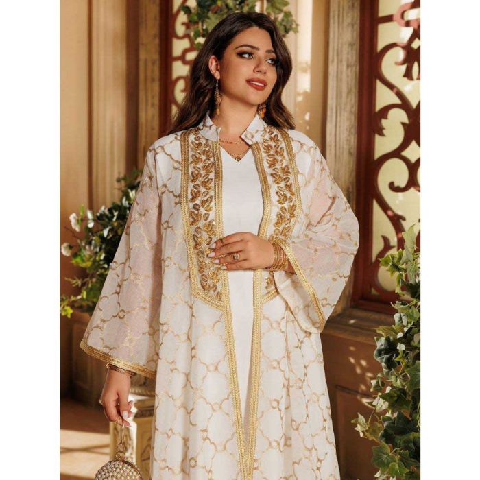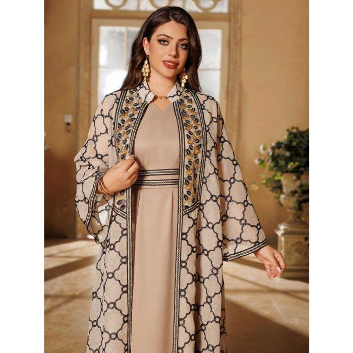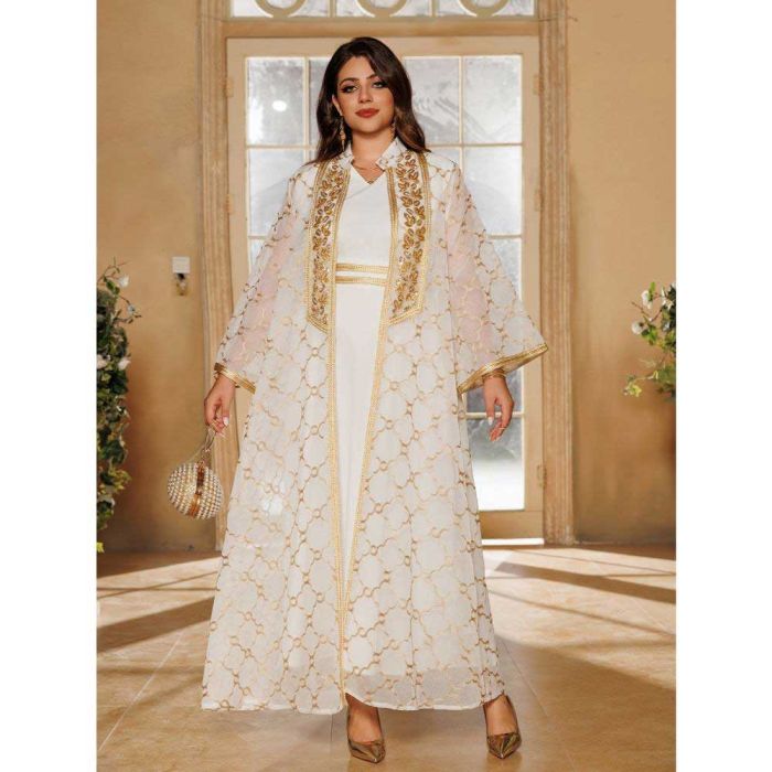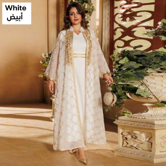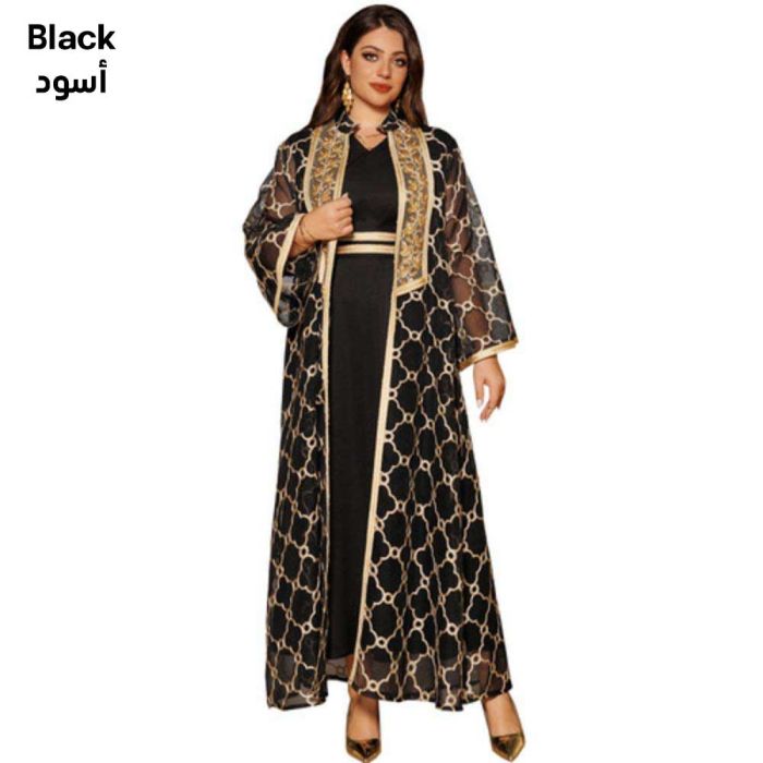 - Features a complete set design combining an inner dress with an outer abaya for a refined look