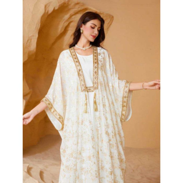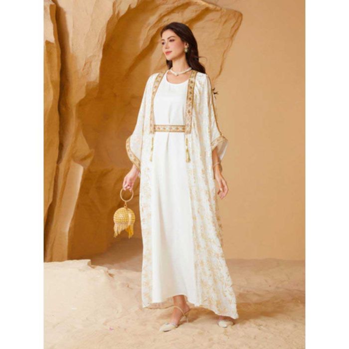 - Features a complete set design combining a dress and an abaya in an elegant coordinated look
