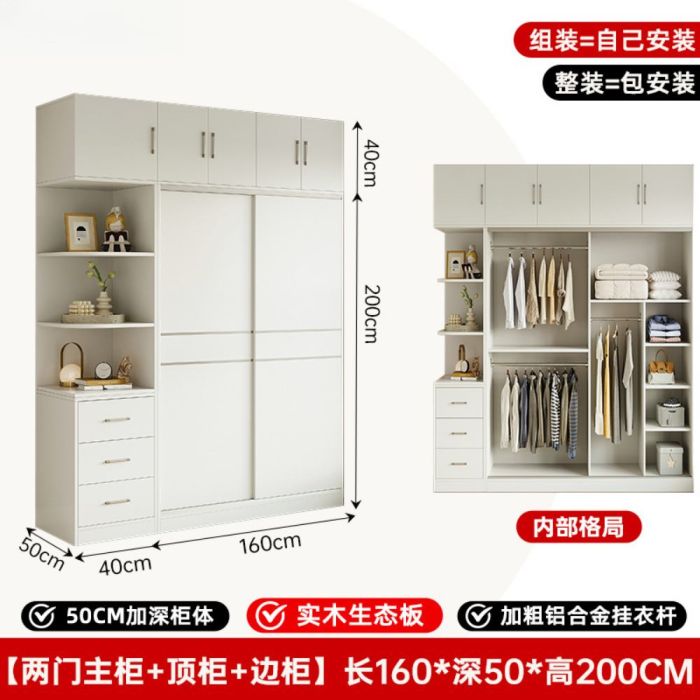 - ELMVALE Solid Wood Sliding 2 Doors Wardrobe with Top Cabinet and Side Display Unit