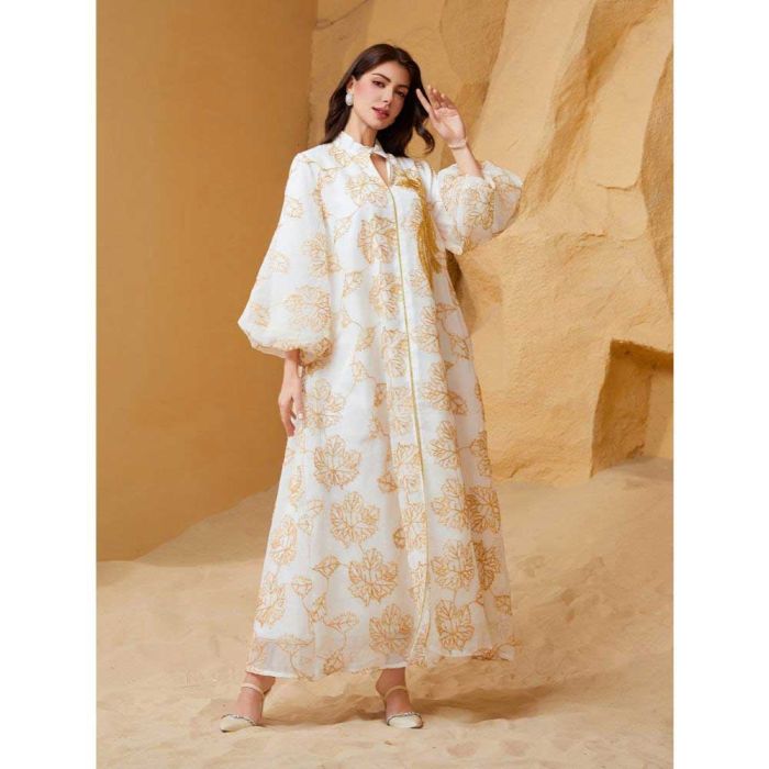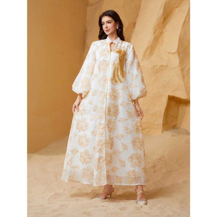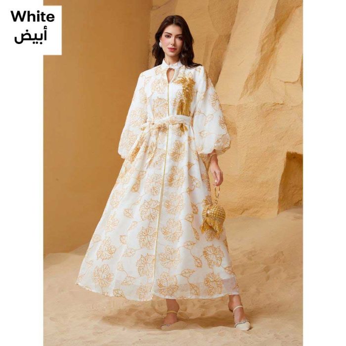 This Embellished floral dress for women made from lightweight Doris fabric, offering a refined flowing look, embellished details add a luxurious Middle Eastern touch, elegant design suitable for evening events and special occasions, enhancing presence with confidence