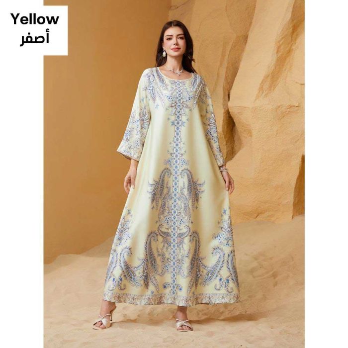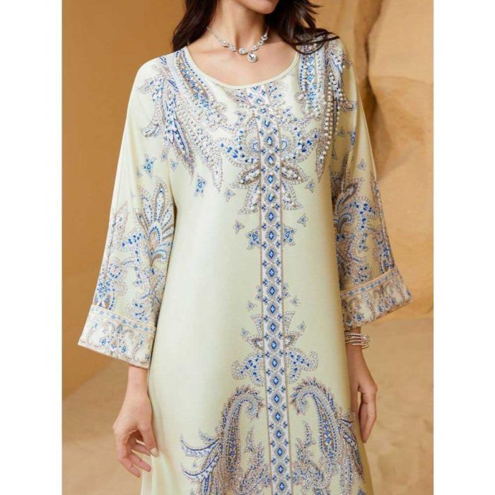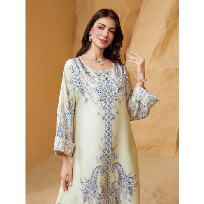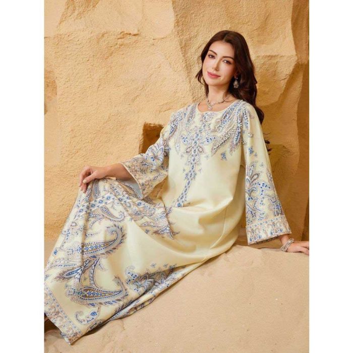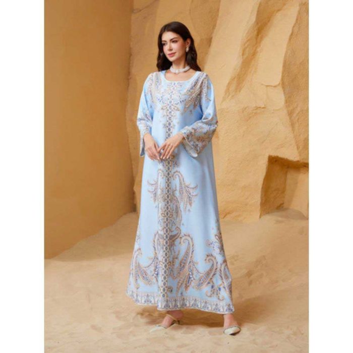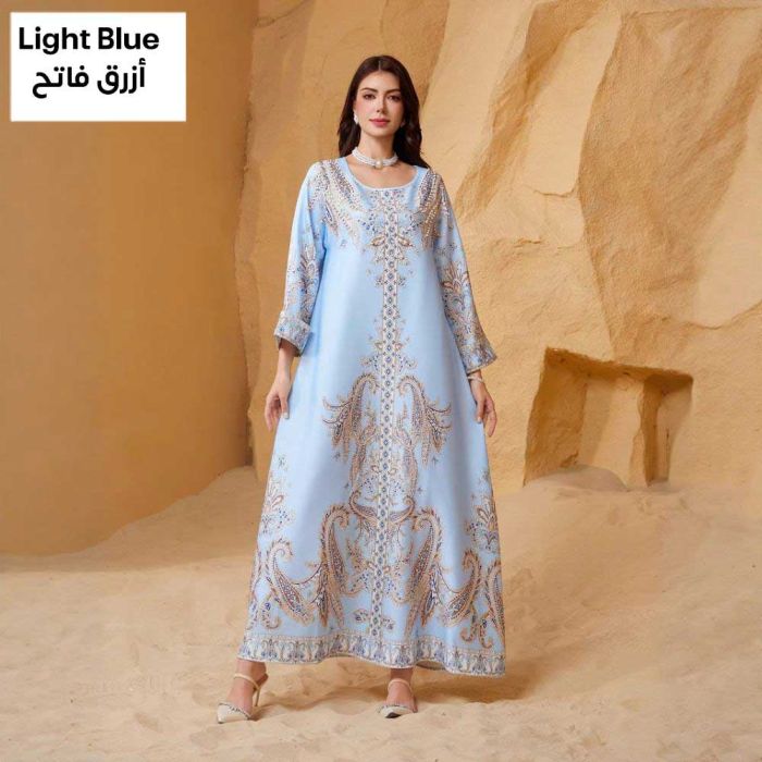 This Embellished round neck abaya for women made from soft polyester material, offering a refined flowing look, embellished details add a luxurious Middle Eastern touch, suitable for occasions and evening events, completing the look with confidence