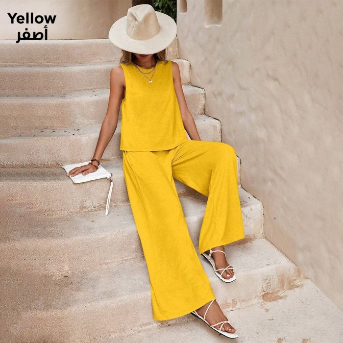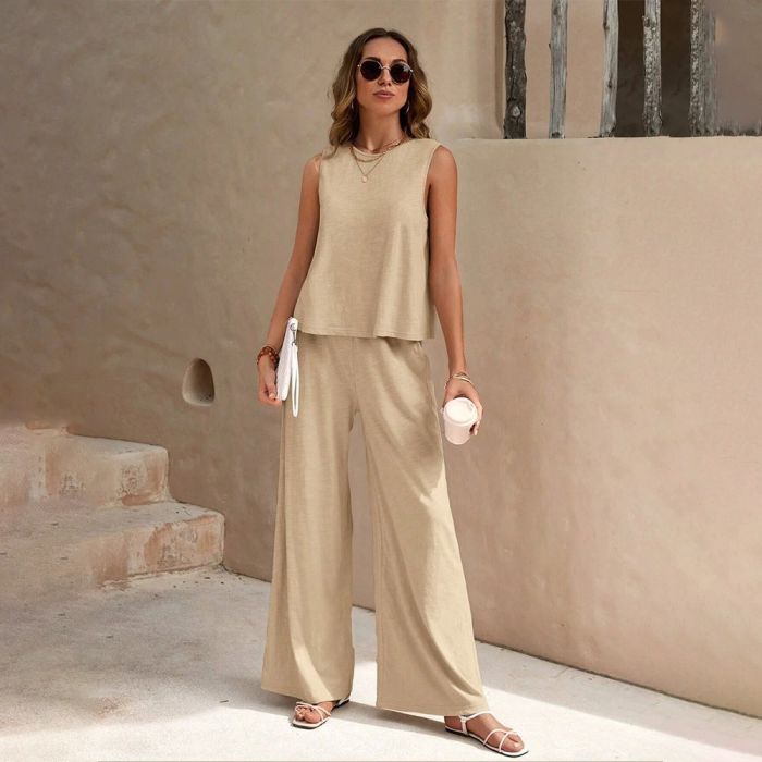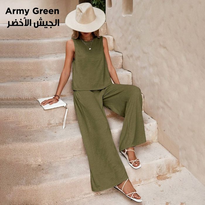 Exude a stylish and practical summer look with this European-inspired casual set. It consists of a sleeveless, flowing top and wide-leg pants, allowing you to move freely and maintain a simple elegance. Neutral colors and sophisticated details like accessories and a hat add a touch of luxury without being overly ostentatious. Perfect for outings, travel, or everyday looks that combine comfort and sophistication.Today’s Deal is European Design Casual Two-Piece Summer Set For Women