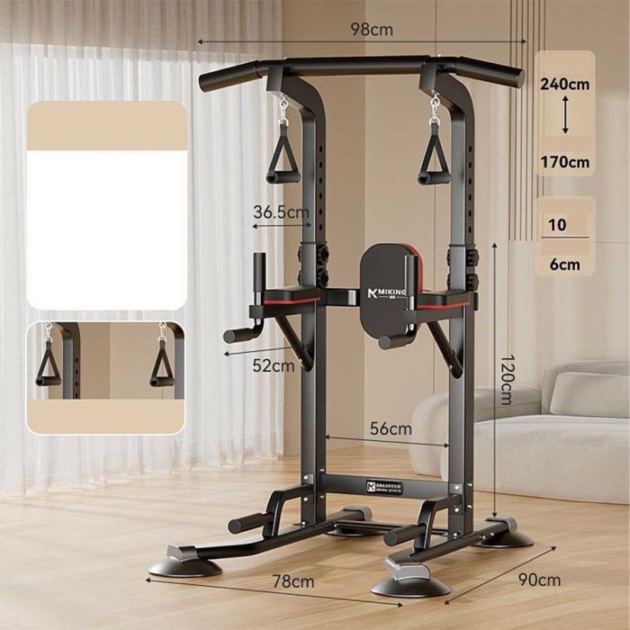 This exclusive adjustable power tower comes with hanging rings for expanded home workout options. Built with reinforced 40 mm steel tubing (1.2 mm thick), it supports up to 750 kg and features a stable anti-slip 8-shaped base. Ideal for pull-ups, dips, abs, chest, and arm exercises with exceptional balance and durability.