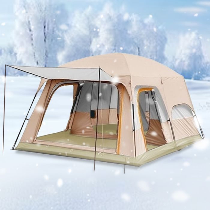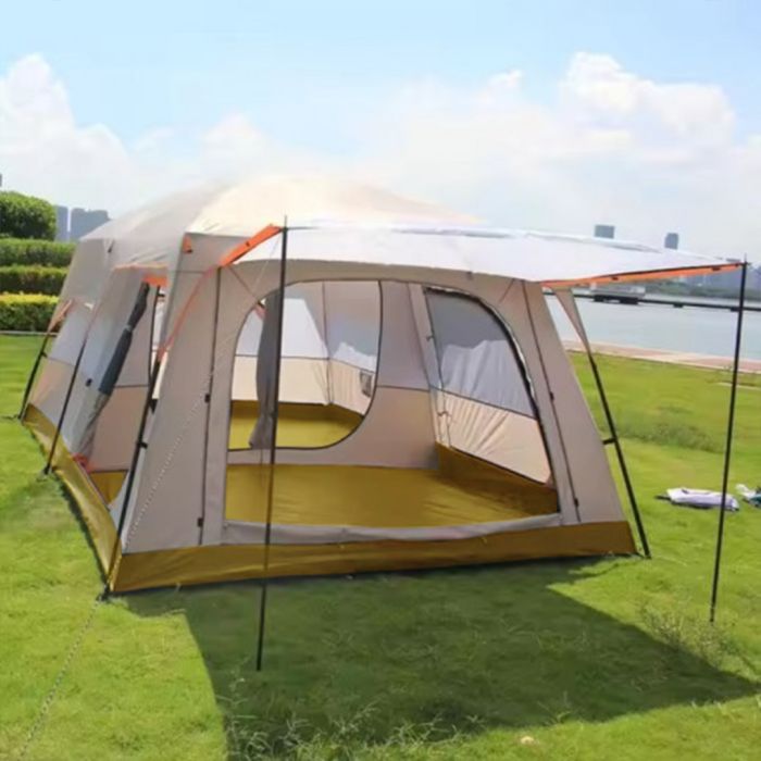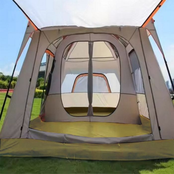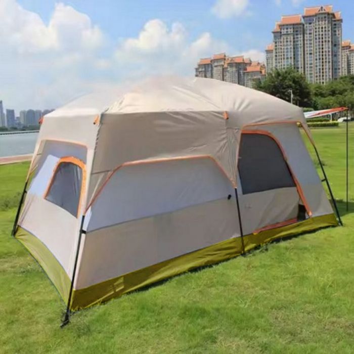 Embark on unforgettable adventures with your family and friends using this spacious tent, featuring two bedrooms and a living room to provide comfort and privacy while camping. Designed to comfortably accommodate 8-10 people, it offers ample space for sleeping and relaxation. Made from high-quality, water-resistant Oxford polyester fabric, this tent ensures excellent ventilation and durability to protect you from weather volatility. Ideal for various outdoor activities, such as camping, beach trips, fishing, picnics, or festivals. With easy setup and a practical design, it guarantees that you enjoy every moment of your outdoor experience with comfort and convenience.