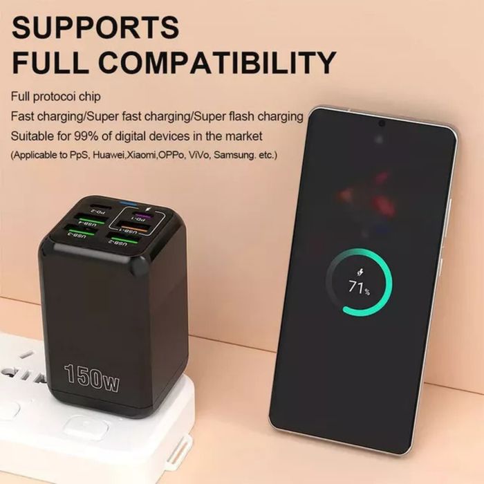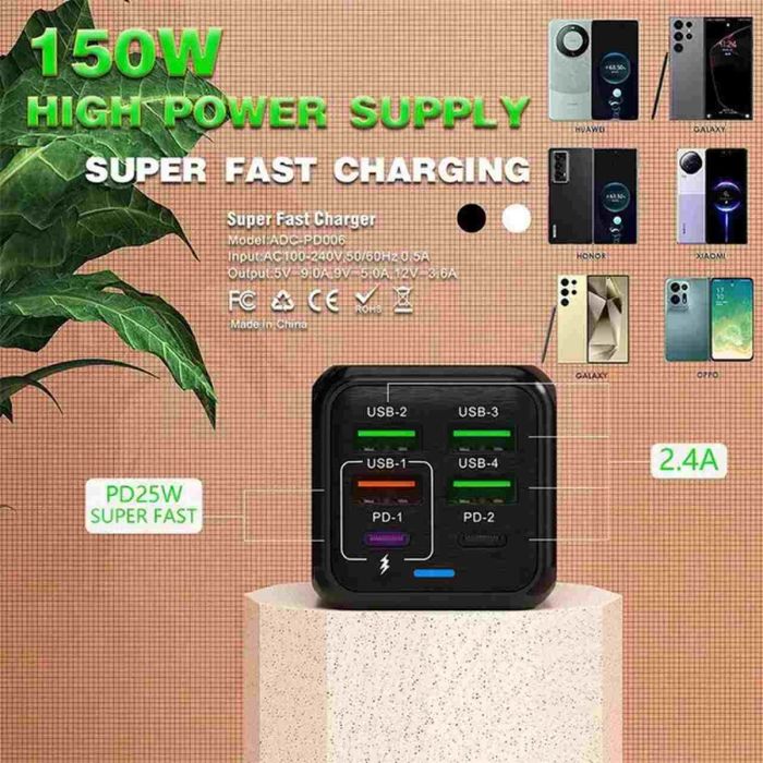 Power multiple devices at once with this powerful 6-port USB-C fast charger that delivers up to 150 W of total output. Equipped with GaN technology, it charges smartphones, tablets, laptops, and more safely and efficiently. Designed with smart power distribution, it adapts to your device’s needs while remaining compact and ready for travel or desktop use.