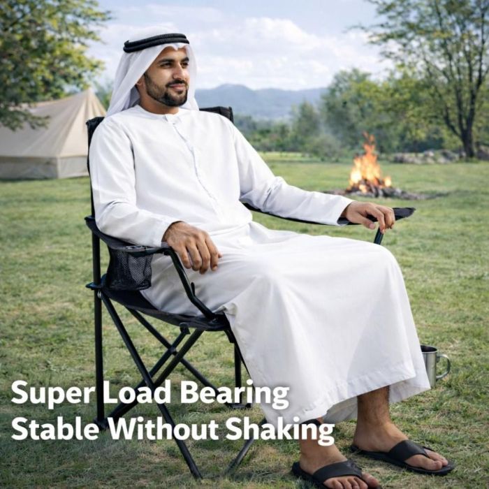 Experience ultimate comfort on the go with this folding chair. Designed with a perfect balance of comfort and style, it's the ideal choice for camping, beach trips, or outdoor adventures. This cleverly designed chair ensures complete relaxation thanks to its integrated armrests and cup holders. It also offers superior stability thanks to its sturdy frame, which can support up to 130 kg, and its non-slip feet, providing stability and comfort for all users.