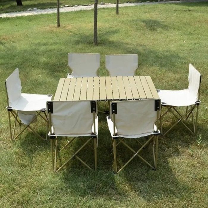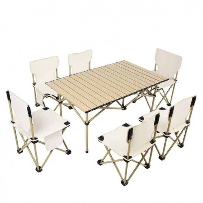 Enjoy a unique camping experience with this practical and durable folding table and chairs set. Six chairs to suit your needs. Lightweight and easy to store, with a spacious tabletop and comfortable chairs offering excellent back support. Ideal for picnics and camping, with convenient dimensions and long-lasting quality.