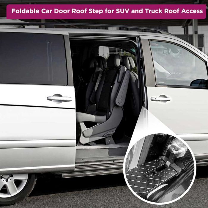 A sturdy yet lightweight car door step that provides easy and safe access to the car roof and luggage racks, with a non-slip design and multiple uses.